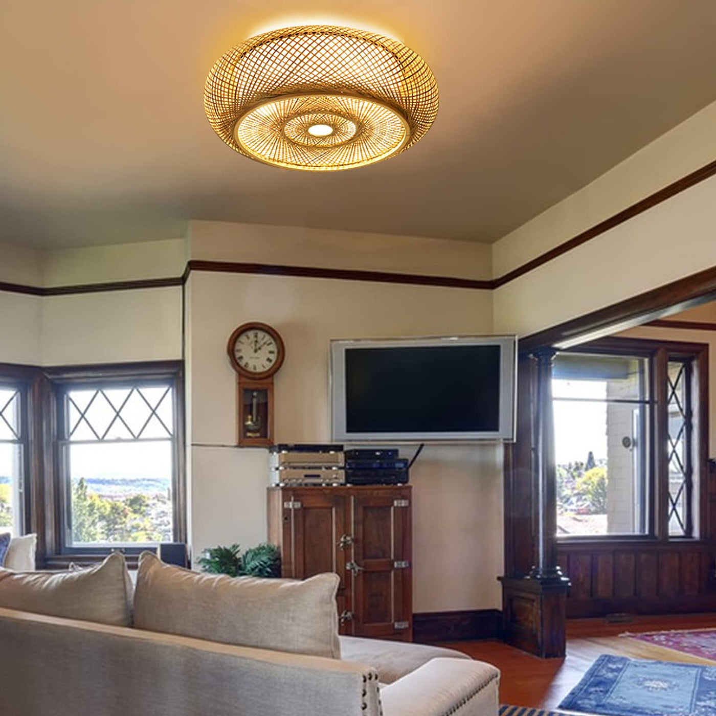 Rattan Chandelie Flush Mount Ceiling Light Bamboo Woven Light Fixture,Mesh Wicker Pendant Light Rattan Basket Boho Led Light Han