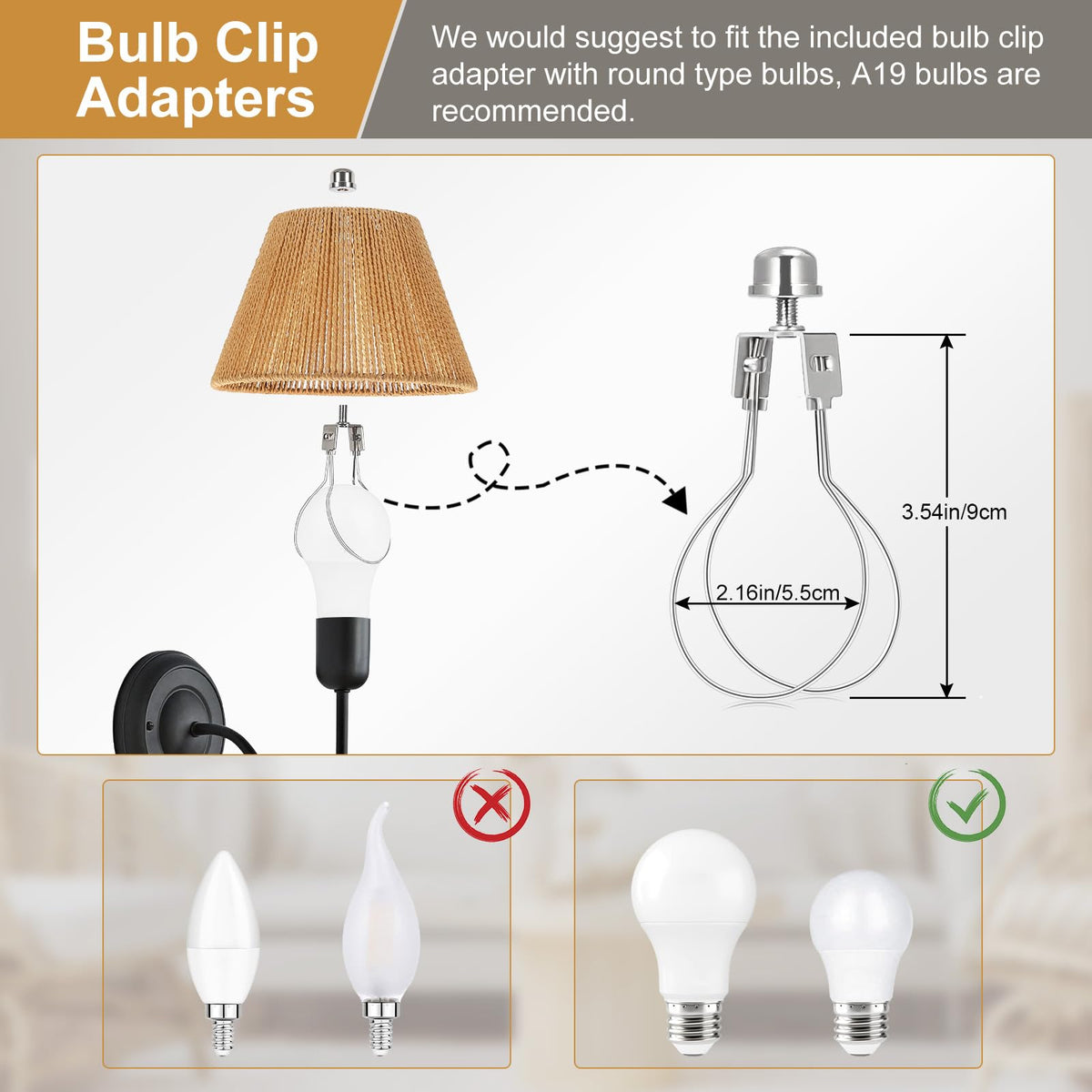 Q: What type of bulbs are compatible with these lamp shades?A: The Rattan Lamp Shades come with clip-on bulb adapters that are primarily suited for round type bulbs. We recommend using A19 bulbs for optimal compatibility.