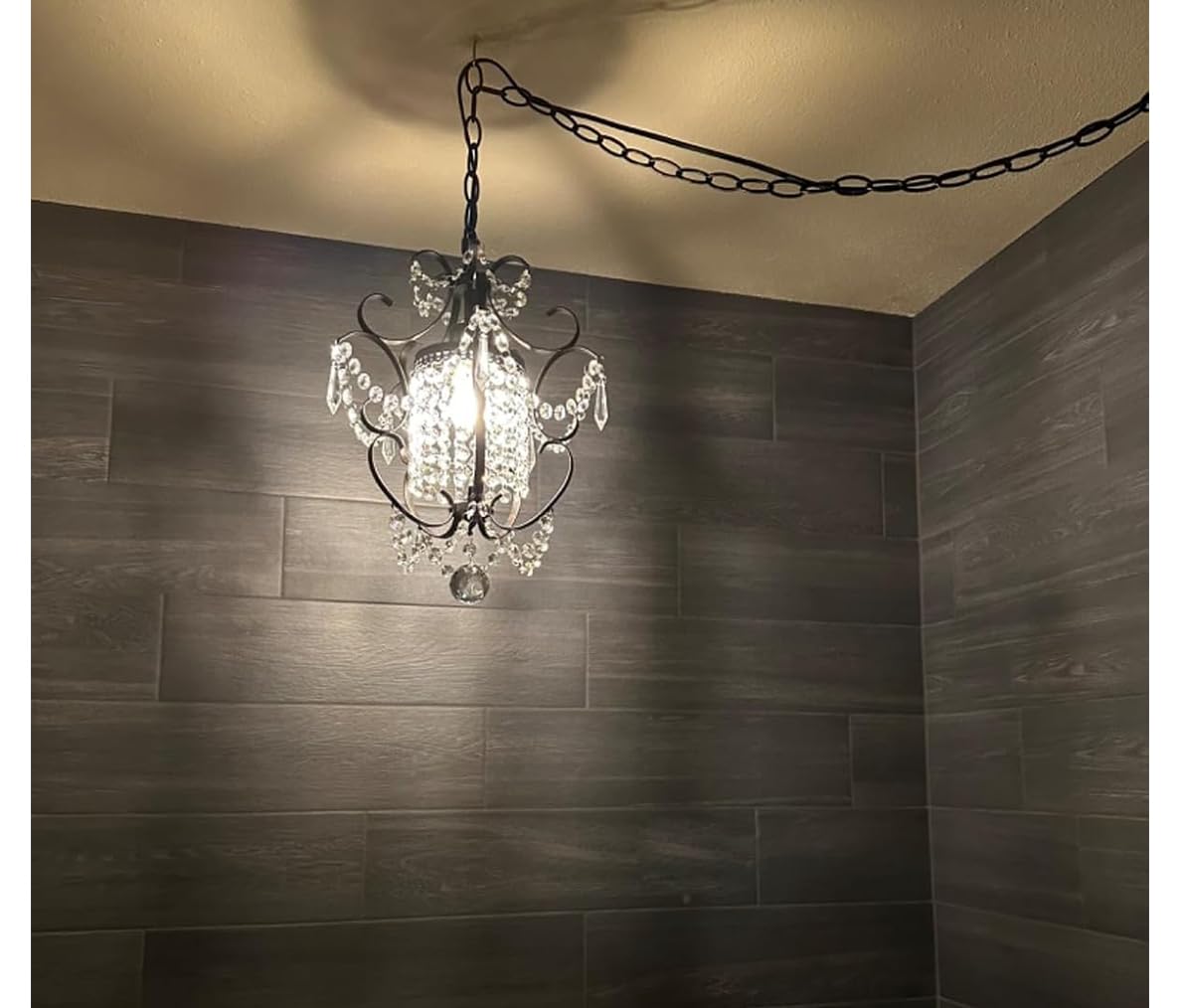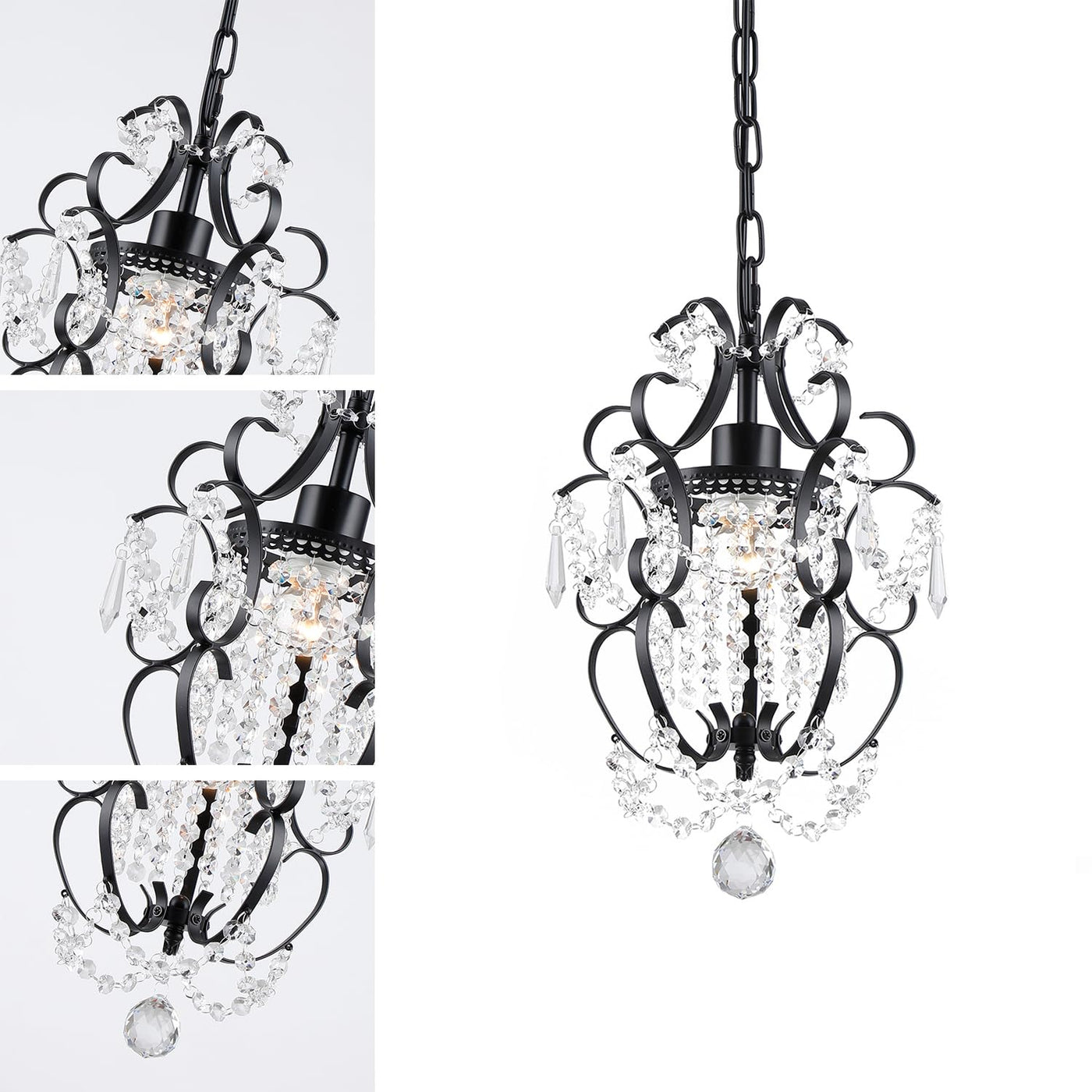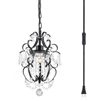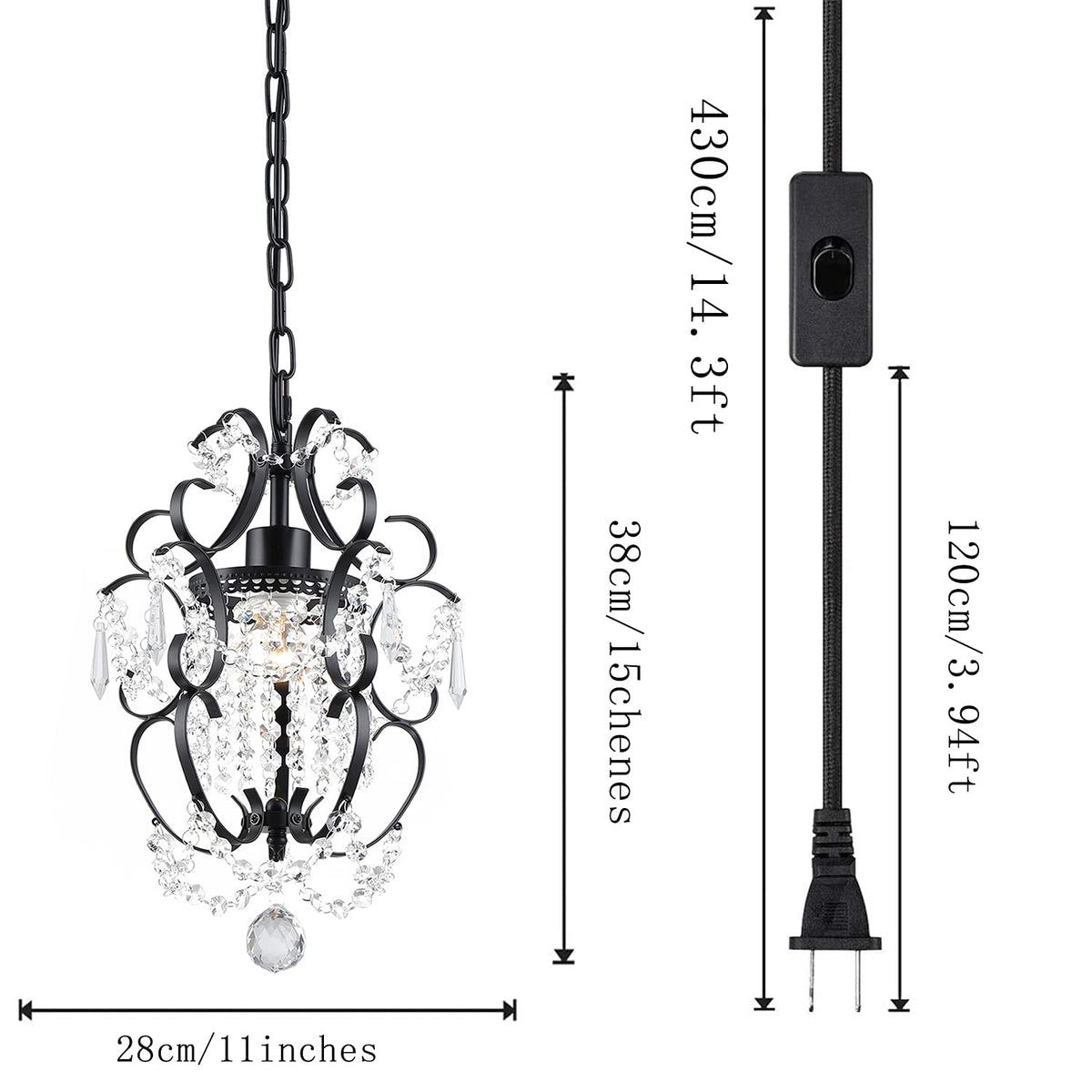 Raymalux Plug in Chandelier Mini Black Chandelier Iron Ceiling Light Fixture for Bedroom,Living Room,Dining Room SPECIFICATION Fixture Material: Metal Shade Material: Crystal Fixture Color: Black Shade Color: Clear / Transparent Crystal Type: K9 Crystal Number of Lights: 1 (Bulb not included) Bulb Base:1 x E26 Light Size: 11 inches X15 inches Weight(after assembled): about 4lbs Suggested Room Fit: Dining room, living room, bedroom, foyer, office. Need assembly by customer.