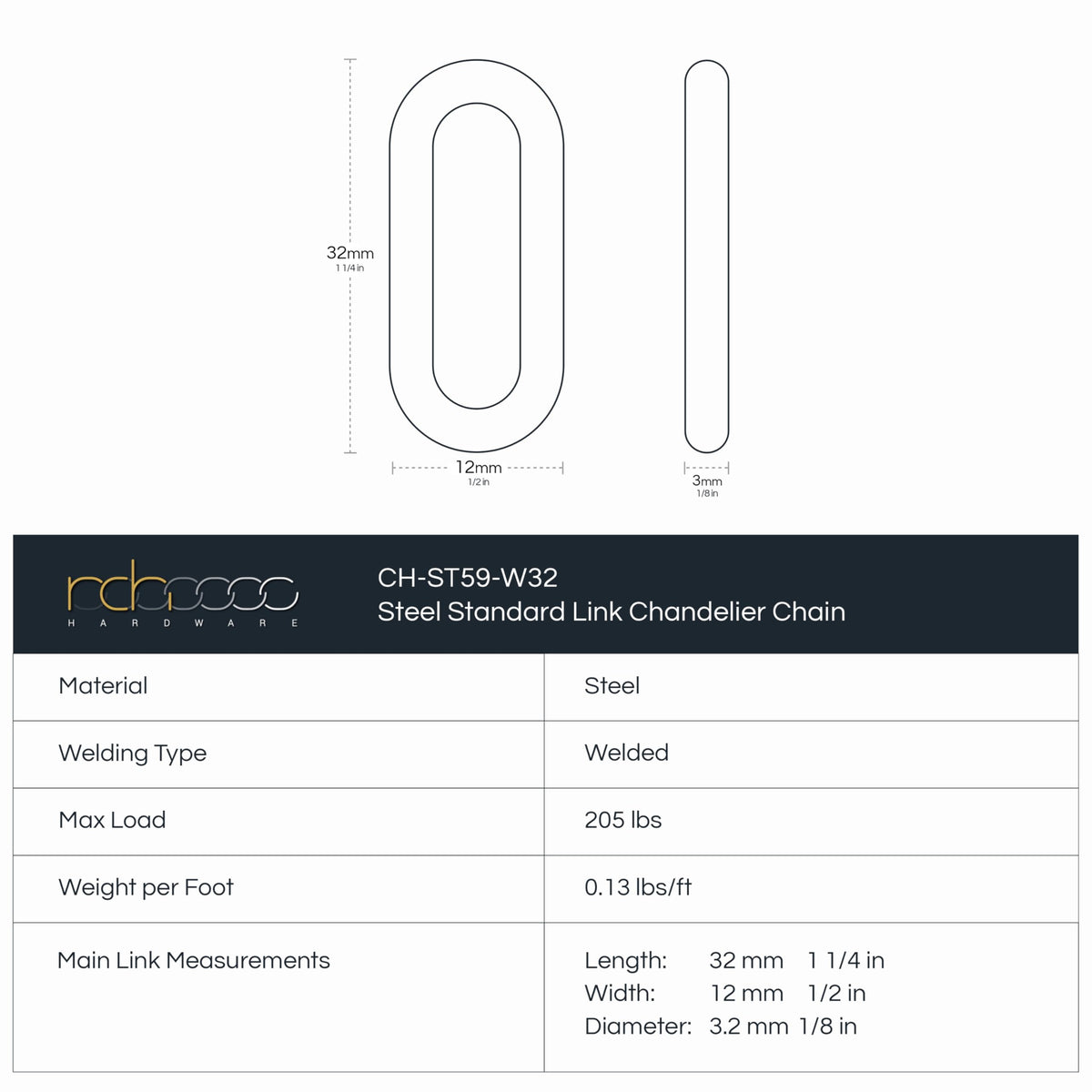 Description Rch Hardwares Steel Chandelier Chains Combine Stylish Design And Lasting Strength For A Wide Variety Of Applications. Our Chains Offer Fantastic Support For Your Indoor Applications (Or Outdoor, Under Cover) With A Maximum Weight Load Of 205Lb. Crafted In High Quality Steel And Available In Numerous Finishes, Our Chains Can Match Any Room Aesthetic, Making Them An Ideal Complement For Chandeliers, Pendant Lights, And Elevated Pieces. After All, We Established Rch Hardware In 2010 Because We Believe That Everyone Should Have Access To Premium Quality Hardware-And In The Years Since, We Have Delivered Outstanding Results To Professional Architects, Contractors, And Designers Throughout The Nation. Disclaimers As Mentioned Above, This Chain Has Welded Links That Cannot Be Opened, So A Chain Connector Must Be Used For Attachment. The Stated Weight Capacity Of This Chain Is For Static And Motionless Applications. These Chains Are Not Meant For Any Dynamic Uses That Would Cause The Chain To Move Or Swing. This Includes But Is Not Limited To: Swing Sets, Porch Swings, Hanging Daybeds, Etc. Our Chains Are Decorative And Should Never Be Used For Any Towing, Overhead Lifting (Other Than Your Fixture Of Course), Safety Applications, Or Any Uses Bearing Human Body Weight.