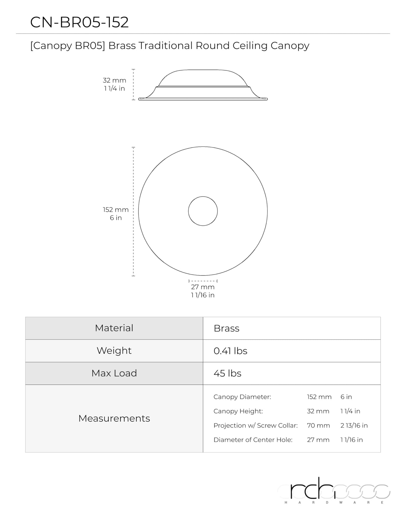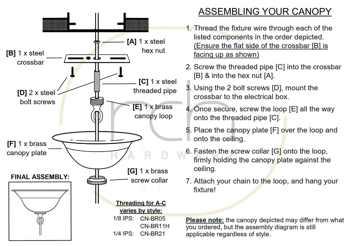 Add a well-rounded finishing touch to any lighting fixture with our Traditional brass ceiling canopy. The classic design of this solid brass 6 inch canopy features a subtle lipped edge with a matching loop and screw collar for a cohesive look. This canopy is perfect for traditional fixtures, but its so universally appealing that it also complements modern, vintage, rustic, minimalist, and transitional chandeliers or pendant lights. Install on sloped or flat ceilings with electrical boxes 6 inches and under to hang fixtures up to 45 lbs. Instantly transform any chandelier or pendant light in your foyer, kitchen, dining room, bar area, living room, bathroom, bedroom, or guest room. The canopy plate itself has a 1.06 inch center hole and measures 1.26 inches tall to provide plenty of room for the mounting kit and wiring to comfortably fit within the plate - ensuring no hardware is exposed. Once installed, the matching loop extends 1.46 inches from the canopy plate and has a wire way that can accommodate fixture wires up to 0.28 inches thick. With a wide variety of multiple hardware finishes to choose from, enhancing your light fixture has never been easier! Canopy kit includes a canopy plate, a matching loop with screw collar, assembly instructions, along with the following mounting hardware: a 1.5 inch long 1/8 IPS threaded pipe, 2 bolt screws, a hex nut, and a 3-7/8 inch long steel cross bar with grounding screw.