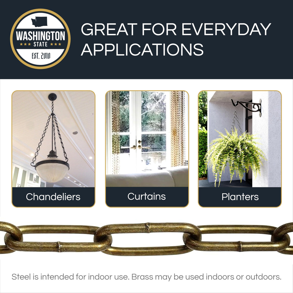 Q: What types of projects is this chain ideal for?A: This chain is perfect for hanging lighting fixtures, mirrors, frames, baskets, planters, and can also be used for making curtain ties and pulls.