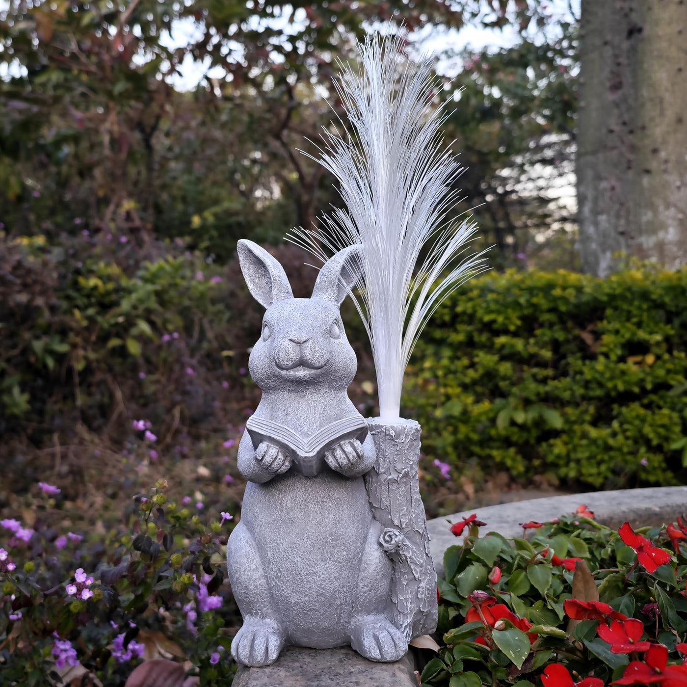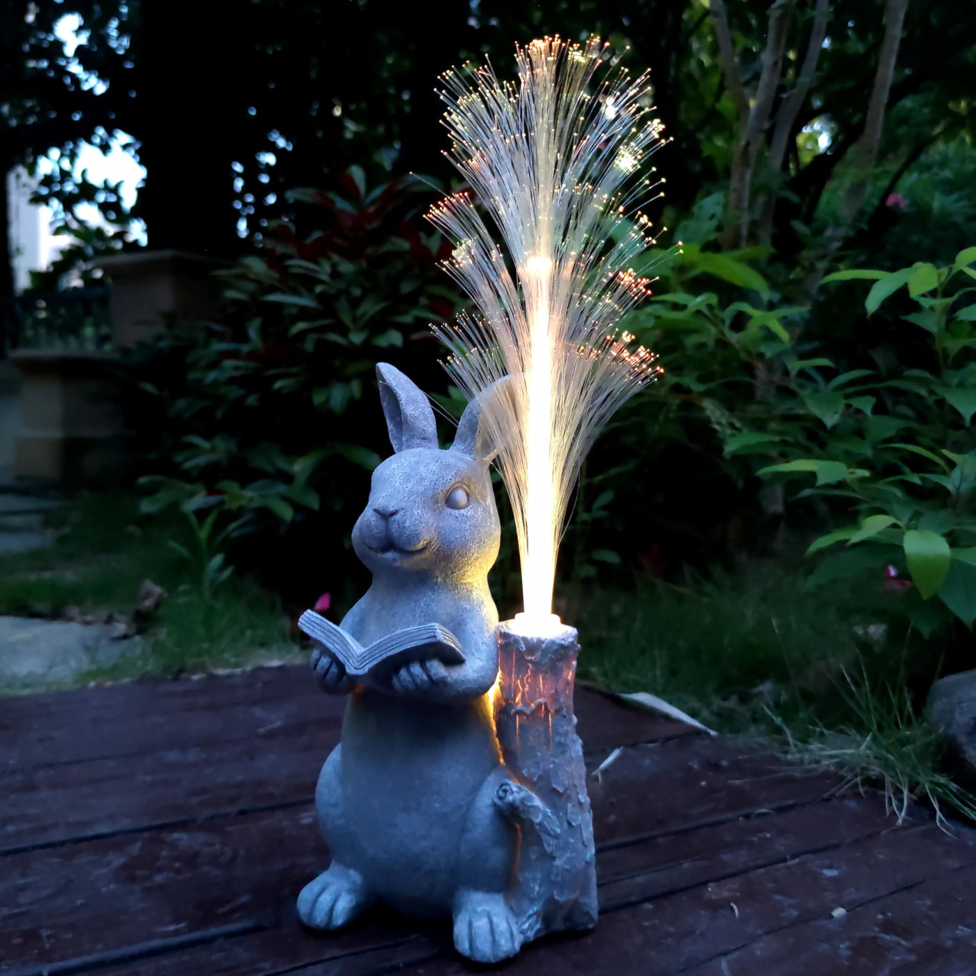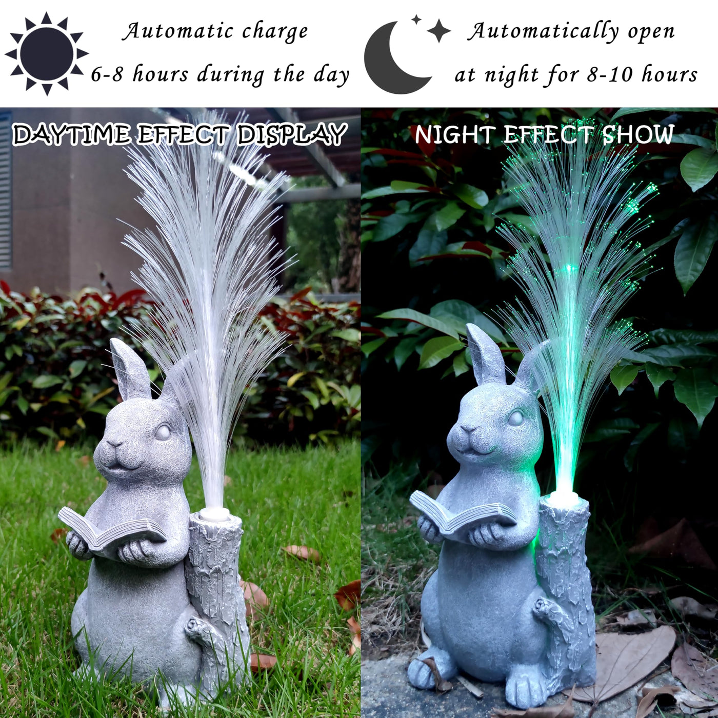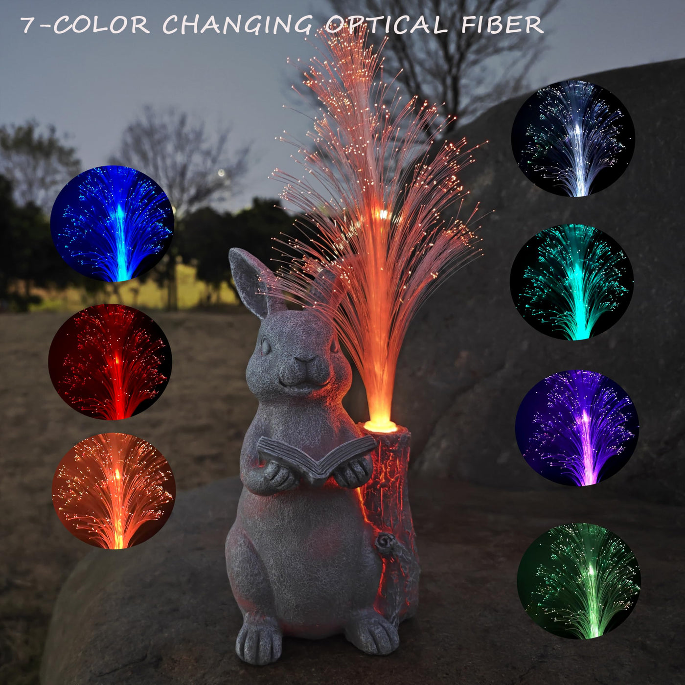 Rctticuu Rabbit Solar Garden Statues,Resin Rabbit Figurine Reading A Book And 7-Color Changing Optical Fiber With Solar Lights,