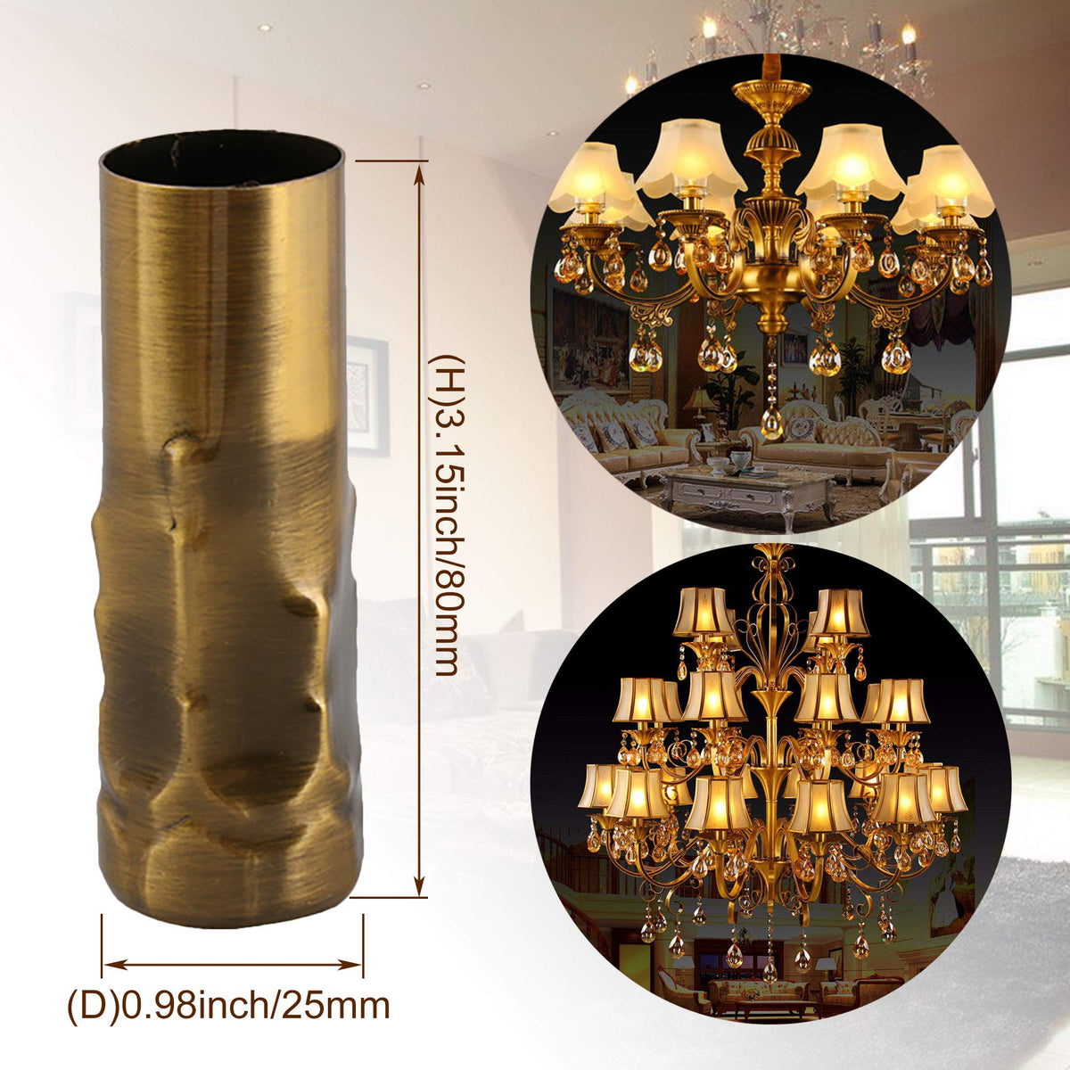 DescriptionSpecifications:Material:IronColor:BronzeBrand name: RDEXPSize:80x25mm/3.15x0.98inch(L x Dia)Weight:158 gFeatures:1.Suitable for European crystal chandeliers, lamp holder arm sleeves.2.It is a good substitute for damaged and old chandelier covers, simple in structure and easy to install.3.These covers are 25 mm in diameter and 80 mm in height. Please confirm the size and purchase as needed.4.The candle drip shape is designed to gather light well and make your space brighter.Package include:6 x Chandelier Cover SleevesEach item with a unique Manufacturing Part Number label on the inner package to confirm it is the qualify checked and genuine item sold from our store, when you have any questions,please provide us the MPN label first.