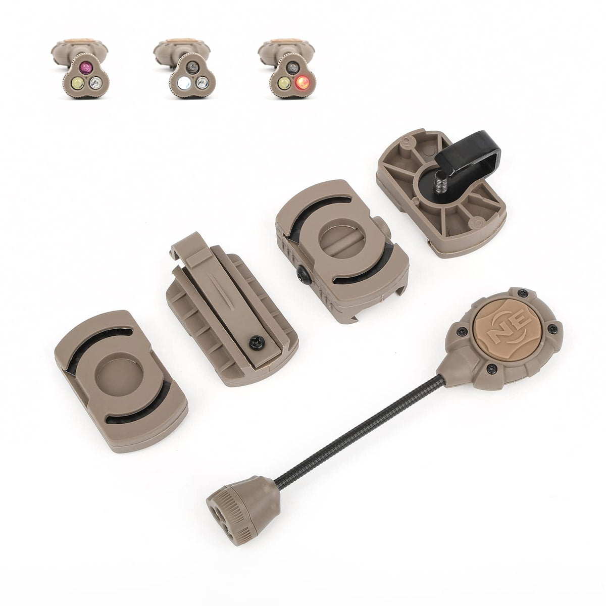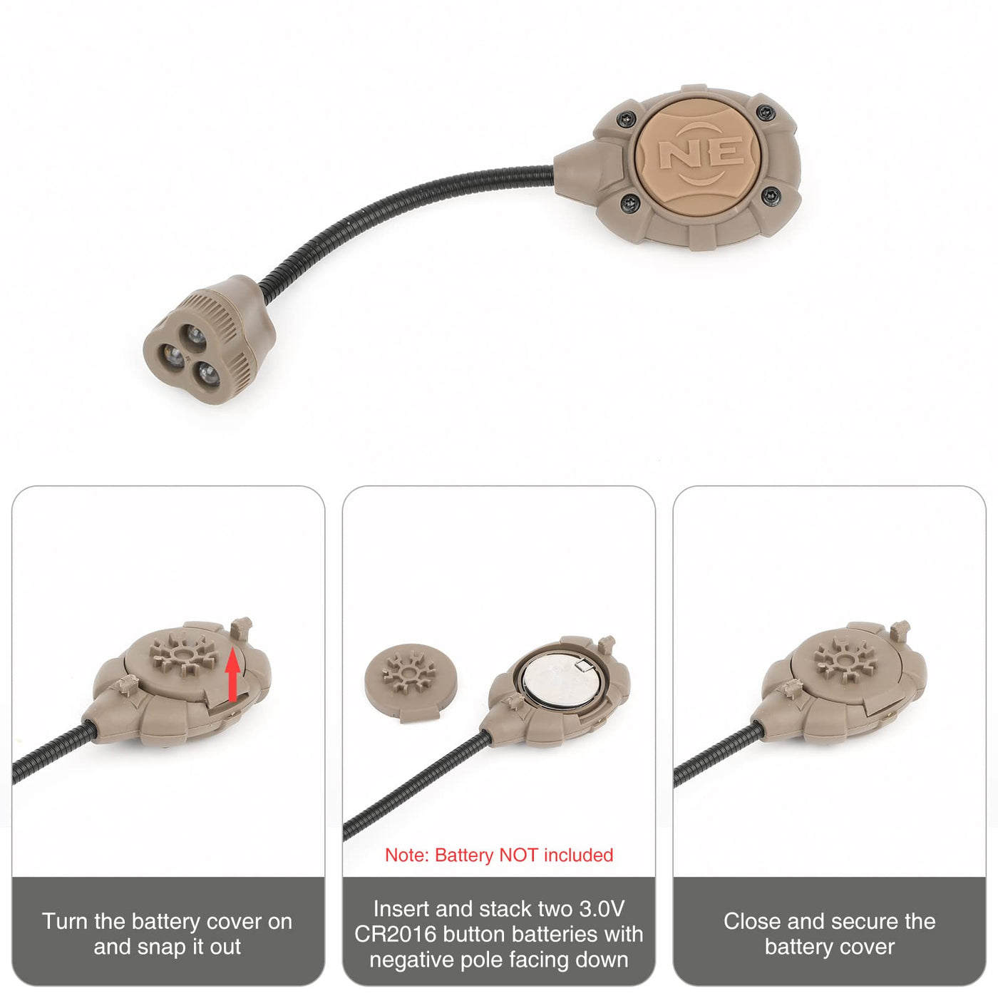 Color: Black / TanMaterial: Nylon Plastic and Metal3 LED: White+Green+IR / White+Red+IR4 Bases: Fit for MICH Helmet / FAST Helmet / MOLLE System / 20mm Picatinny RailBattery: Power by 1* 3V CR2032 Coin Cell Batteries (Note: Battery NOT included)