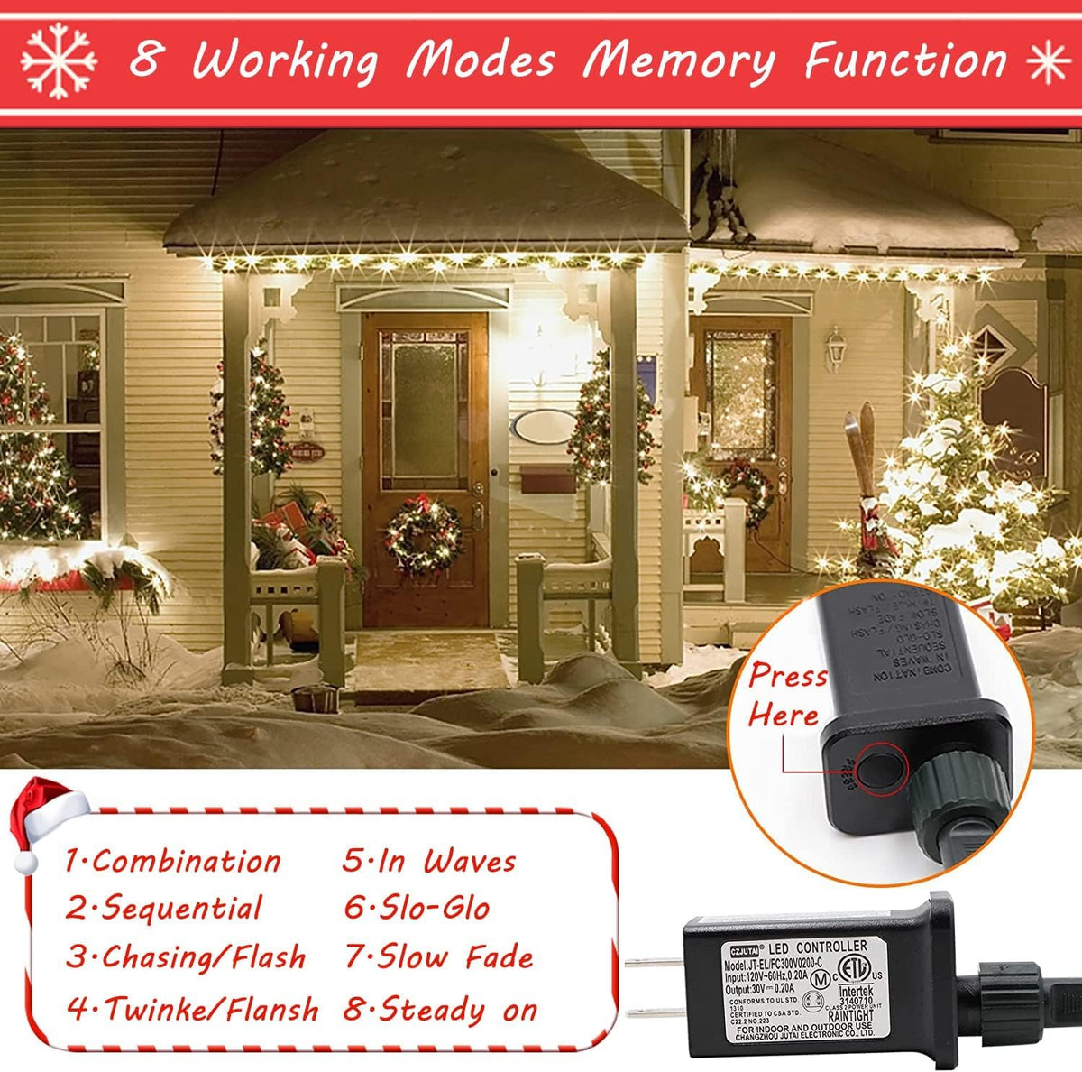 Q: How many lighting modes does the Christmas lights have?A: The Christmas lights feature eight different lighting modes, including combination, in waves, sequential, slogs, chasing/flash, slow fade, twinkle/flash, and steady on.