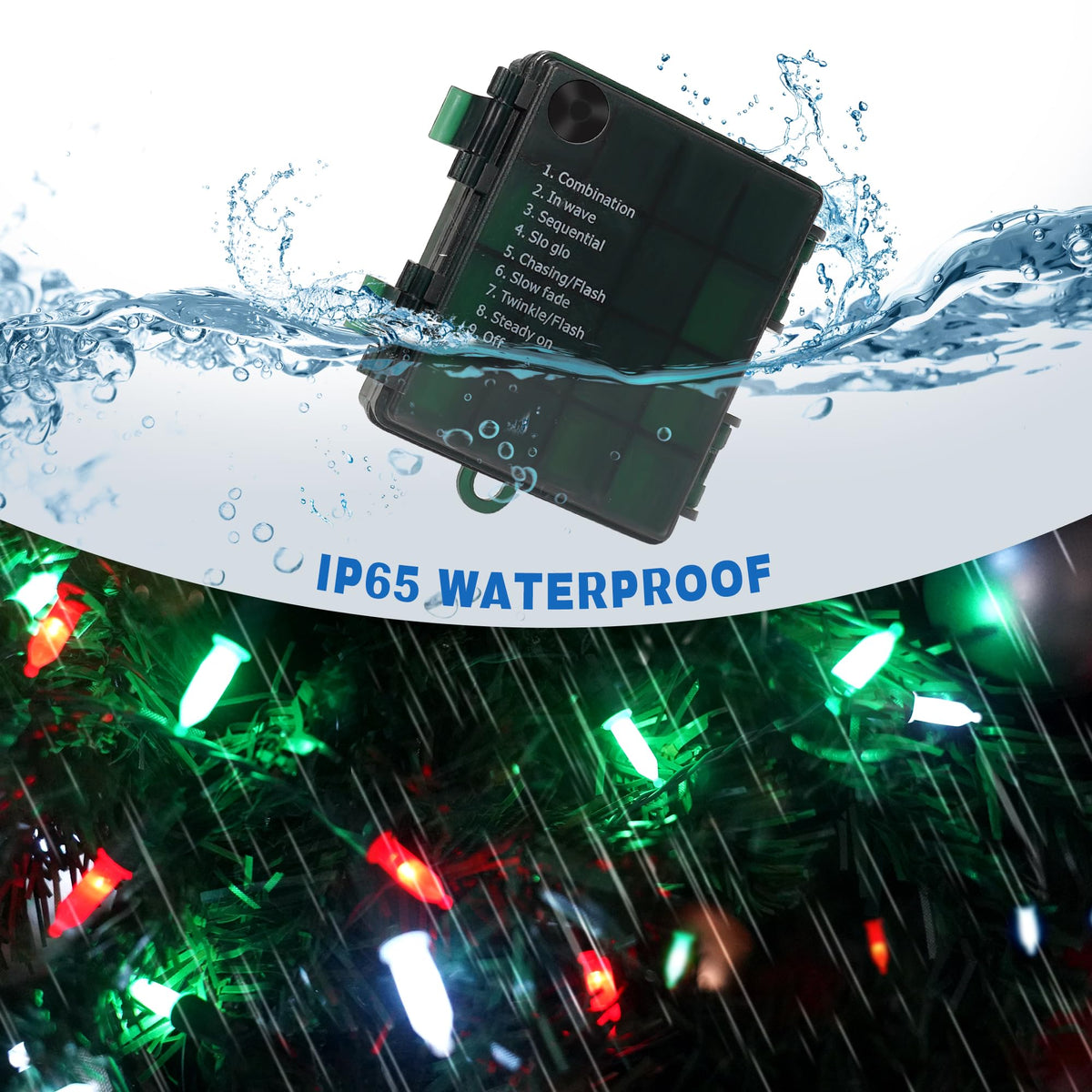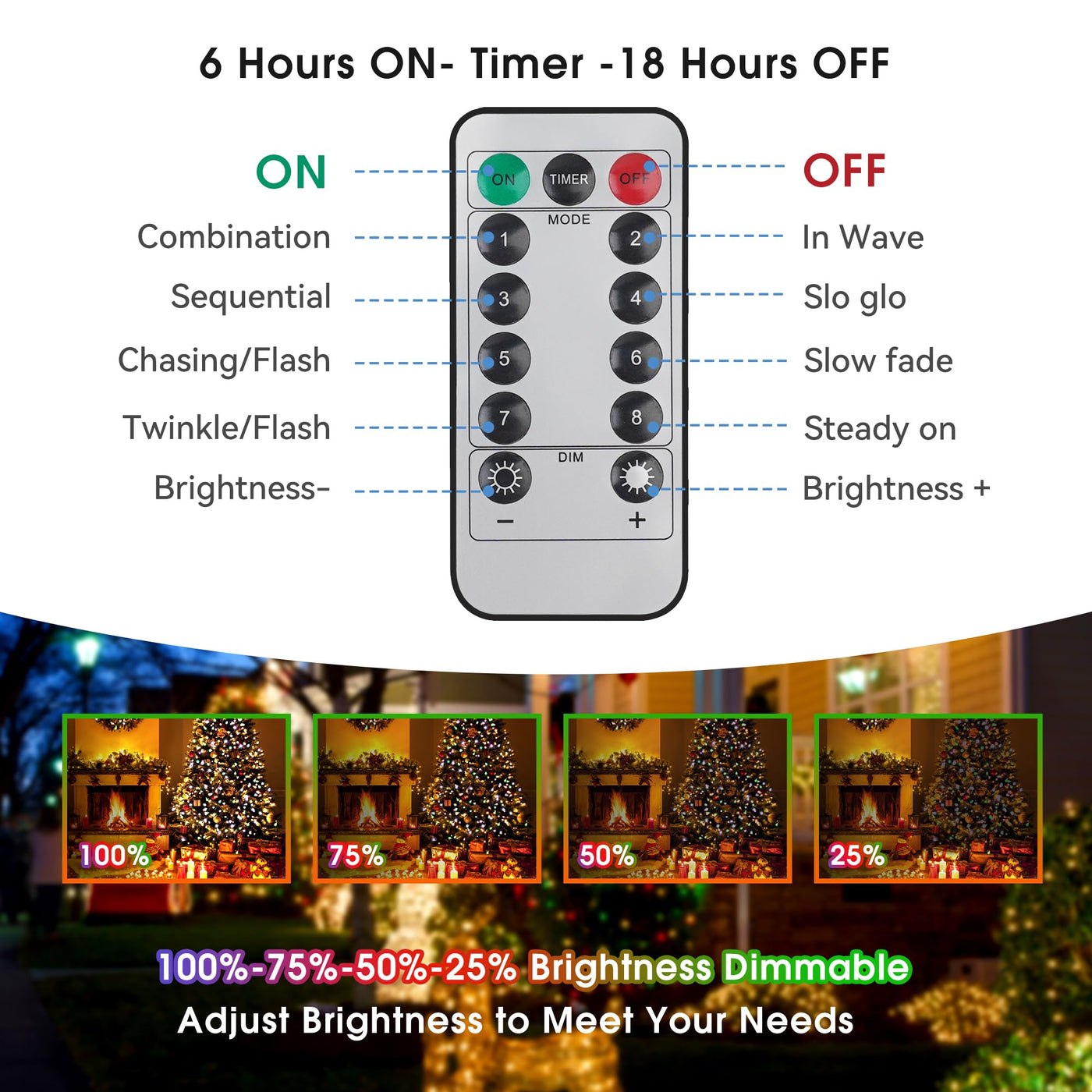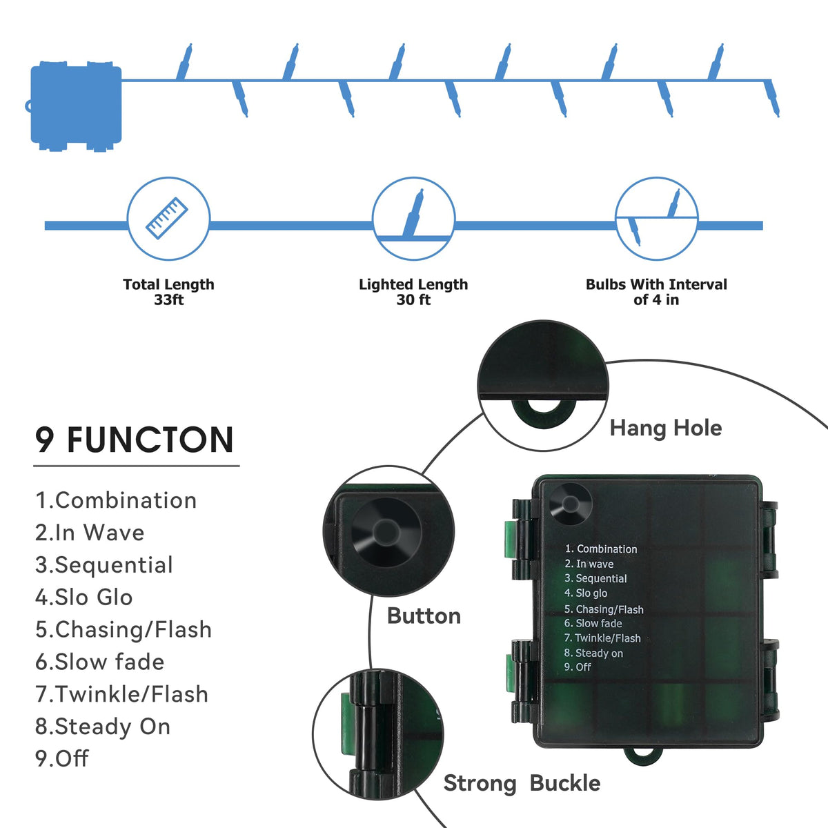 Specifications Lighted length: 33ft Spacing of each LED: 0.33ft LED number: 100pcs Color: Red White Green Battery Powered: 4 * AA battery (Not included), recommend rechargeable AA batteries. Control range: 12ft Timing Program :6 hours on, 18 hours off 8 Lighting Modes: Feel easy to choose from 8 flashing modes. Dimmable Function: Press the DIM-/+ to get the best effect you wanted.