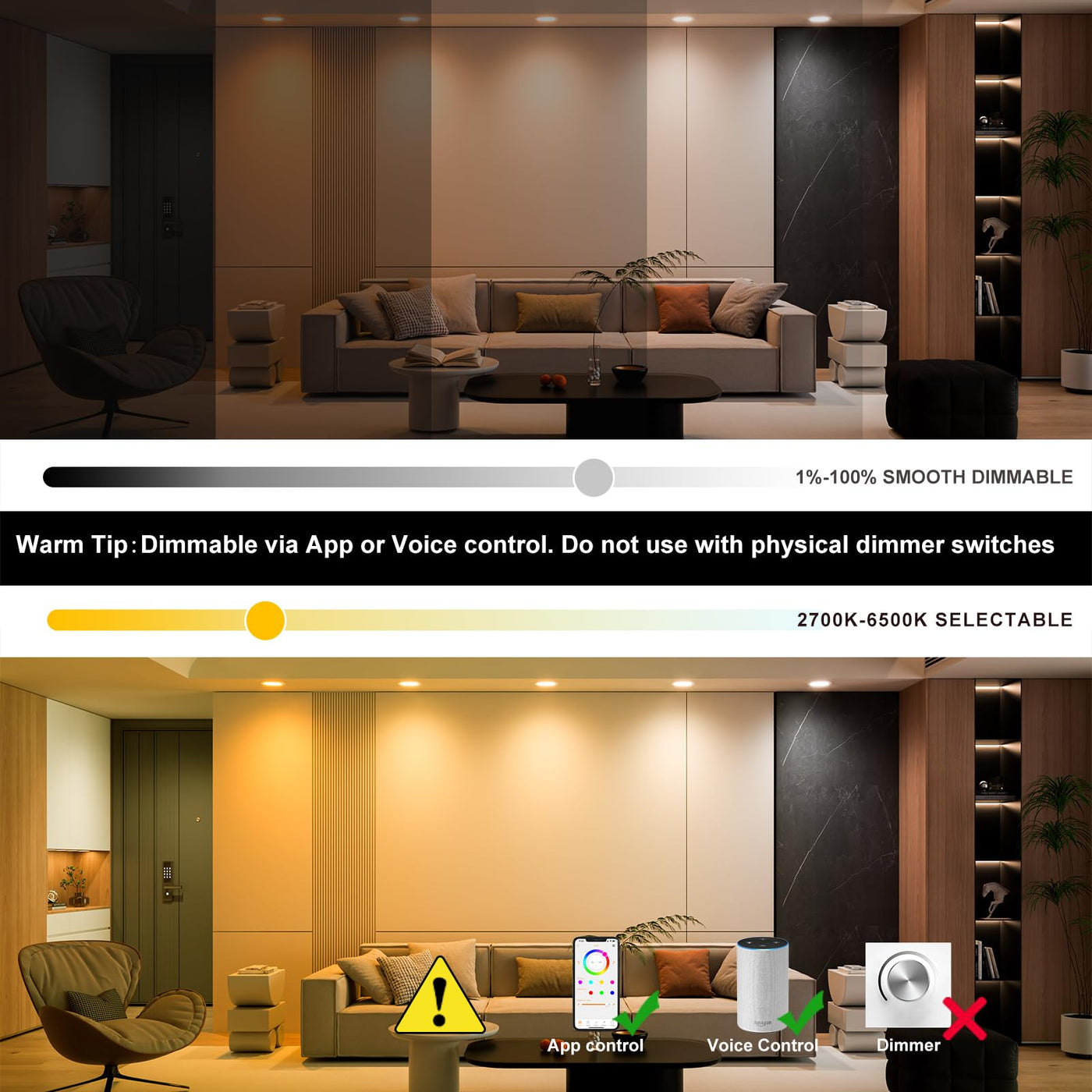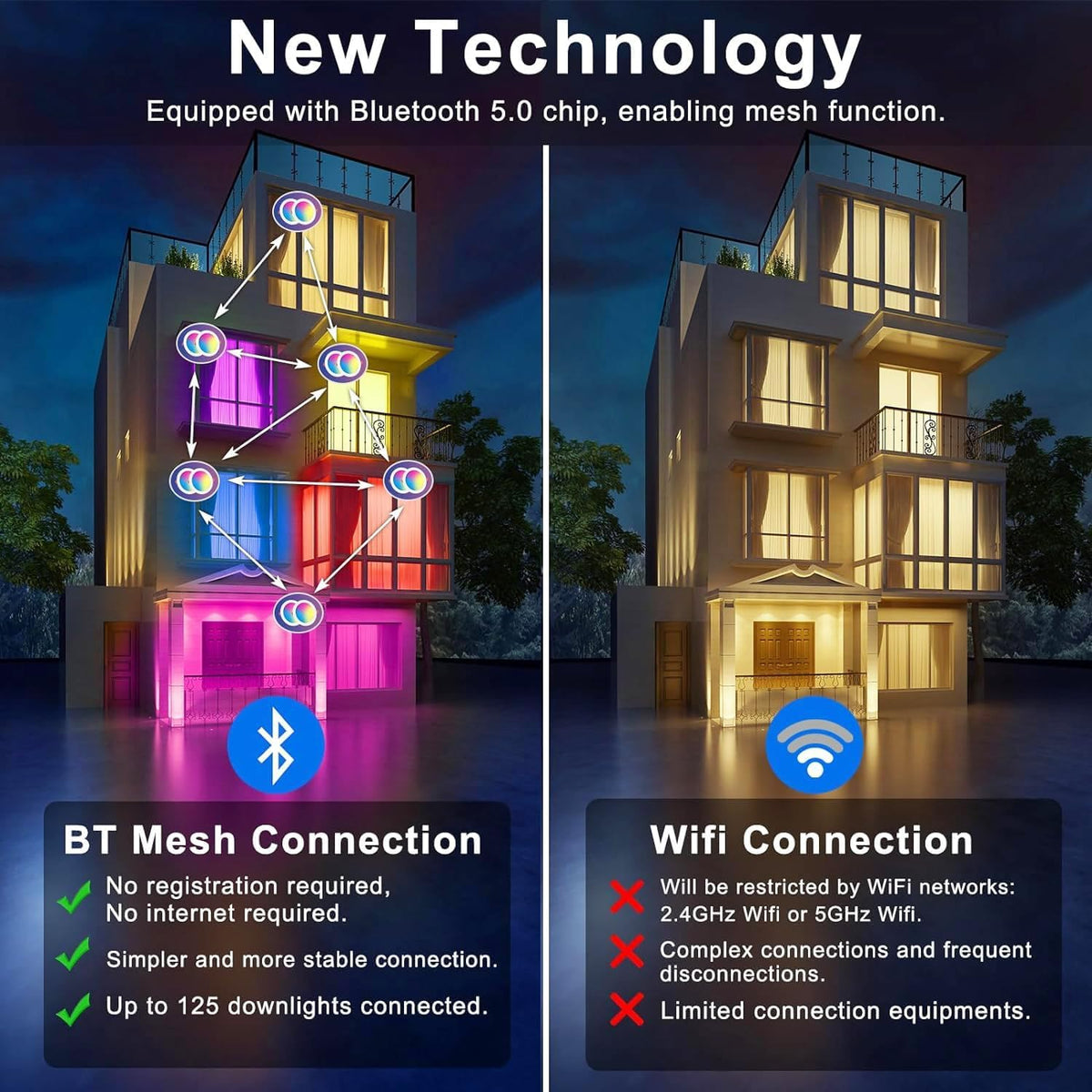 ChangM 16W LED color changing LED Reccessed Downlights The upgraded 16W 6inch Smart Recessed Lighting is compatible with Alexa, which can be controlled through simple conversation, freeing hands and enjoying a beautiful and intelligent life. Connect via advanced Bluetooth Mesh 5.0 network, without hub or wifi. The control distance can reach 20-30 meters, allowing up to 125 lamps to be controlled at the same time. RGBCW color-changing Smart Recessed lighting can be used to set 16 million colors with 2700K~5700K CCT Selectable lights for daily lighting. LED Recessed ceiling lamp has many functions, such as group control, timing setting, synchronous music, timer-schedule, etc. You are waiting to explore. IP44 waterproof grade, suitable for damp indoor environment such as kitchen and bathroom. You can rename scenes such as party, Christmas, Valentines Day, yoga, dinner, games, live broadcast, etc