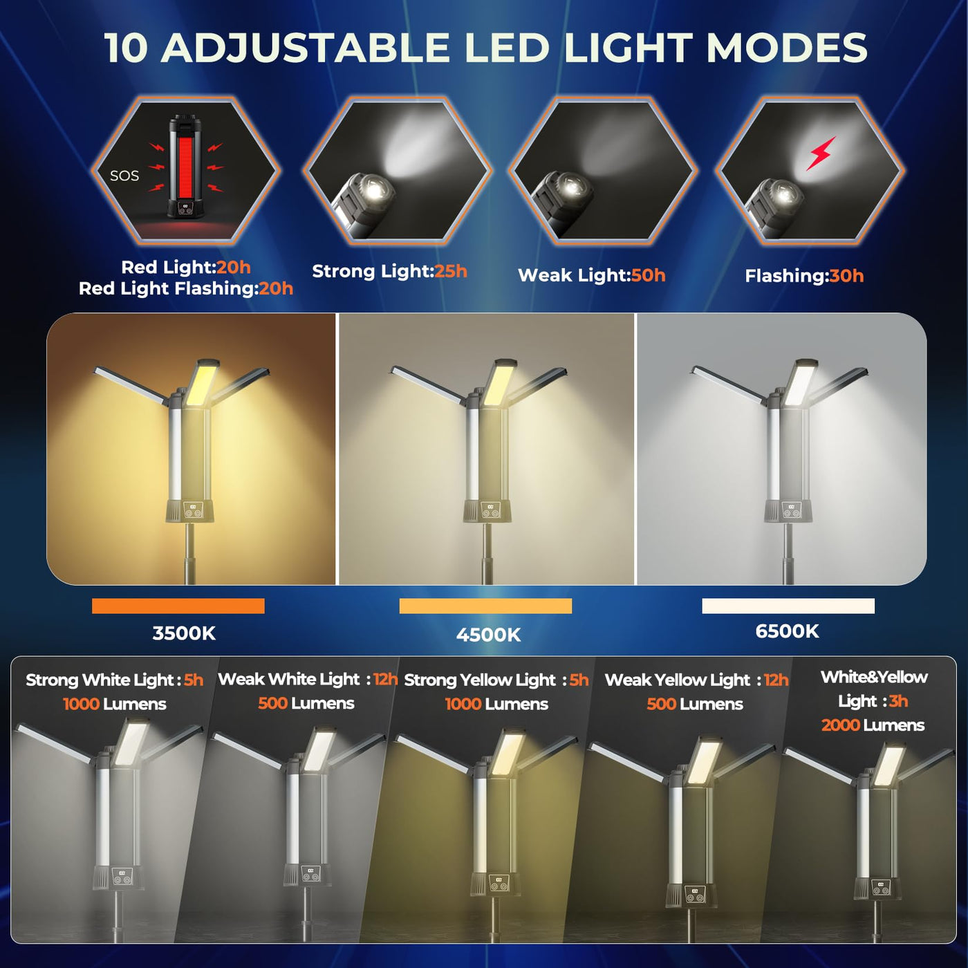 LED Heads and Dimmable Light Sources: This cordless work light is equipped with an XHP50 LED bead and three COB light source boards, delivering a maximum brightness of 2000 lumens with a light range of 328-656ft. Choose from three adjustable modes for the main light—strong light, weak light, and fast flash—and seven modes on the COB panels, including multiple color temperatures and flashing red light options.