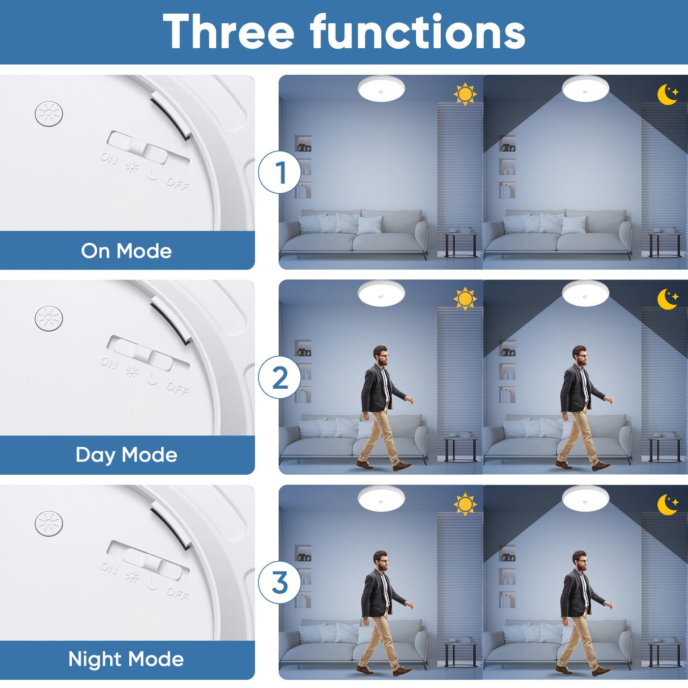 Upgraded Motion Sensor Technology: The KEPLUG ceiling light features three different working modes. In Daylight Mode, enjoy all-day motion detection, activating within 9-16 feet and automatically turning off after 20 seconds without motion. Switch to Night Mode for low-light activation, or select the On Mode for continuous lighting.