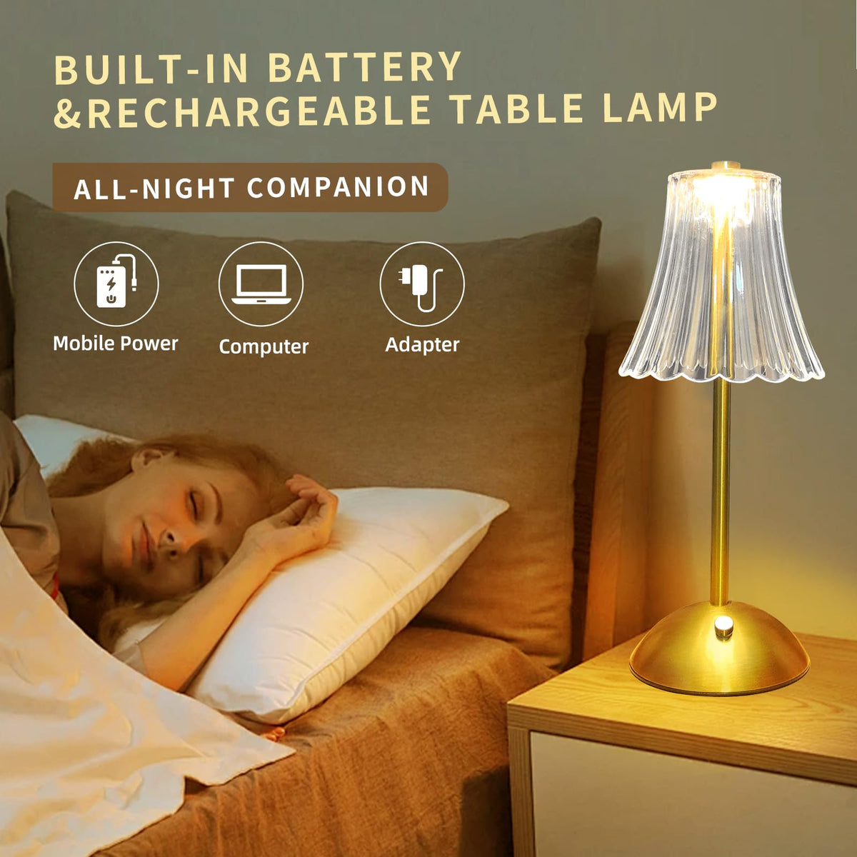 [Cordless Freedom With Long-Lasting 2000Mah Battery]Enjoy Seamless Portability And Zero Cable Clutter. This Rechargeable Table Lamp Delivers Up To Xx Hours Of Soft, Ambient Lighting On A Single Charge-Ideal For Bedrooms, Living Rooms, Kitchens, Or Outdoor Evenings. Never Worry About Outlets Again. | [Elegant Petal-Shaped Acrylic Shade For Modern Charm]A Crystal-Clear Acrylic Shade, Sculpted Into Minimalist Floral Contours, Transforms Spaces With Refined Sophistication. The Design Diffuses Light Gently, Casting A Warm Glow Perfect For Nightstands, Desks, Or As A Decorative Centerpiece In Dining Areas. | [Intuitive Touch Control & Adjustable Brightness]Customize Your Ambiance Effortlessly. With A Simple Tap, Cycle Through Three Dimmable Modes-Soft Mood Lighting For Relaxation, Medium For Reading, Or Bright For Tasks. A Perfect Bedside Touch Lamp Or Workspace Companion. | [Premium Gold Finish & Secure Anti-Slip Base]Elevate Your Decor With Sleek Gold Accents That Blend Vintage Inspiration And Contemporary Style. The Weighted Metal Base, Paired With Silicone Grips, Stays Firmly In Place On Any Surface-From Glossy Countertops To Wooden Nightstands. | [Compact & Versatile For Any Space]Designed For Small Apartments, Dorm Rooms, Or Cozy Corners, This Space-Saving Lamp Combines Portability With Powerful Cordless Operation. Energy-Efficient Led Bulbs And Lightweight Construction Make It Ideal For Travel, Emergencies, Or Everyday Elegance.