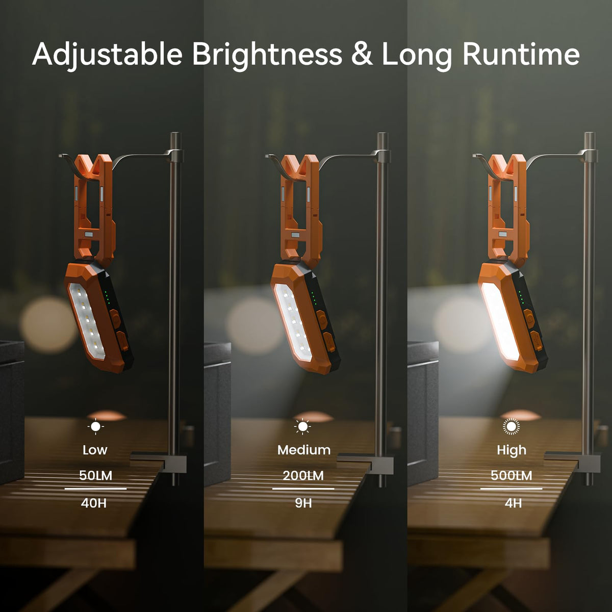 Rechargeable LED Work Light with Adjustable Brightness and Color Temperature This compact rechargeable LED work light provides 500 lumens of brightness with three adjustable modes: high, medium, and low. Whether youre working in the garage, camping outdoors, or performing DIY tasks, this light ensures optimal illumination for every situation. Enjoy customizable color temperatures ranging from 3000K to 6500K, offering both warm and cool lighting options to suit your environment. Lightweight, Portable, and Cordless Design Weighing only 185g and measuring a compact 120 58 36mm, this cordless work light is designed for convenience. Its lightweight and ergonomic build allow you to carry it effortlessly in your bag, toolkit, or pocket. Perfect for tasks on the go, its ideal for auto repair, outdoor camping, and DIY projects. 180 Adjustable Stand and Strong Magnetic Base The 180 adjustable stand offers versatile positioning, enabling you to direct light exactly where you need it. The built-in strong magnets securely attach the light to metal surfaces, freeing your hands for uninterrupted work. This feature is especially useful for mechanics, electricians, and home repairs. Long Battery Life and Fast Charging Powered by a built-in 2500mAh rechargeable battery, this LED work light provides up to 40 hours of runtime on the lowest brightness setting. The Type-C charging port ensures fast and reliable recharging, while the low-battery reminder alerts you to charge before the light runs out. Durable and Waterproof for Any Environment Constructed with IP54 waterproof technology, this light is designed to endure harsh outdoor conditions. Whether youre using it in a dusty workshop or during rainy outdoor activities, it performs reliably. Its robust design makes it the perfect companion for professional and personal use alike.