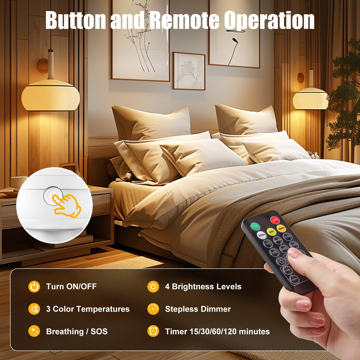 Rechargeable Light Bulb With Remote And Timer For Sconce And Lamp, Battery Backup Night Light, E26 Detachable Charging, Magnetic Base, 3 Lighting Colors, Dimmer, 7W, Lanyard Included, 4 Pack