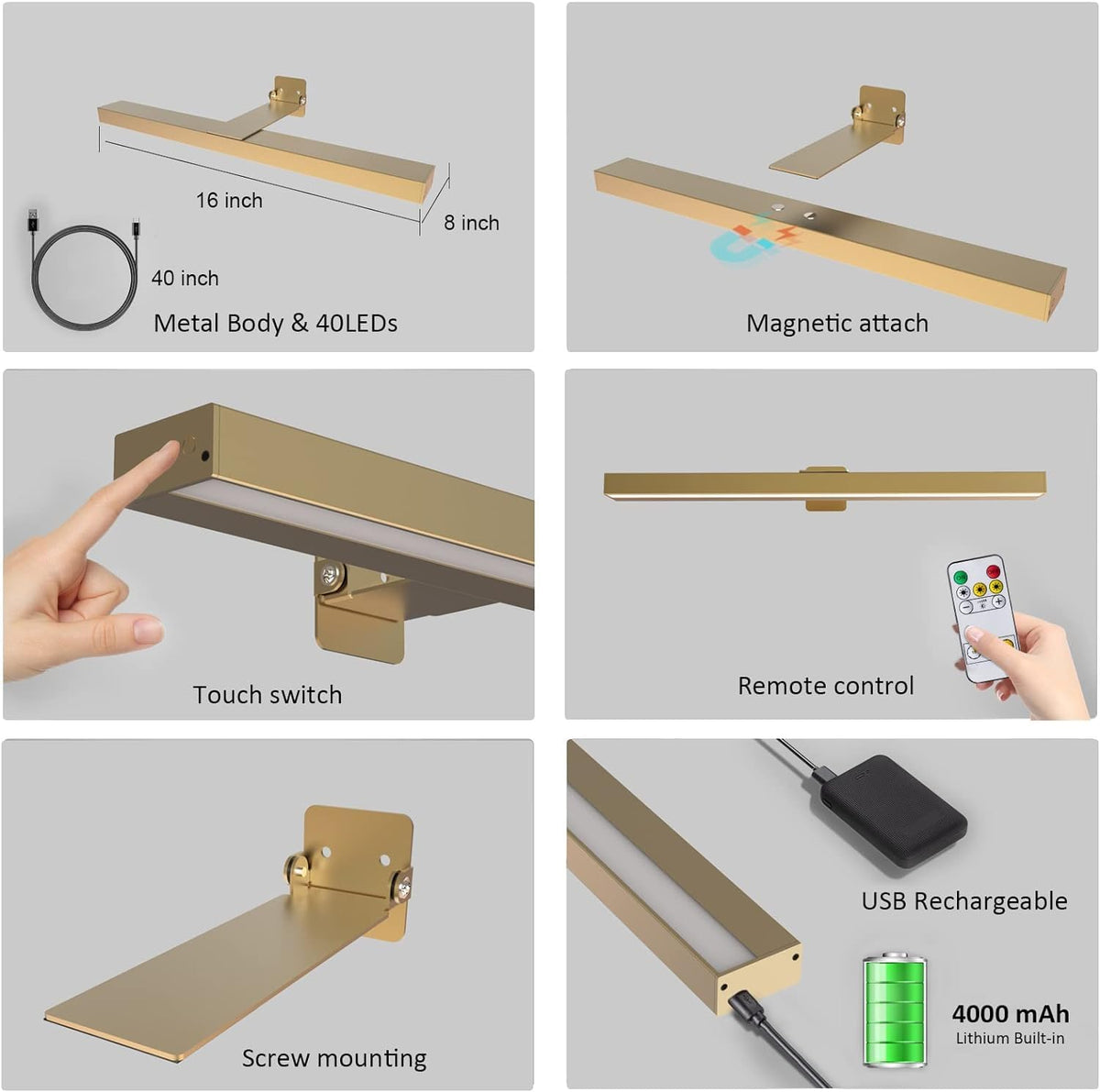 Rechargeable Picture Lights With Remote, 16'' Battery Operated Painting Light Display Lamp With 3 Lighting Modes, Dimmable Dartb