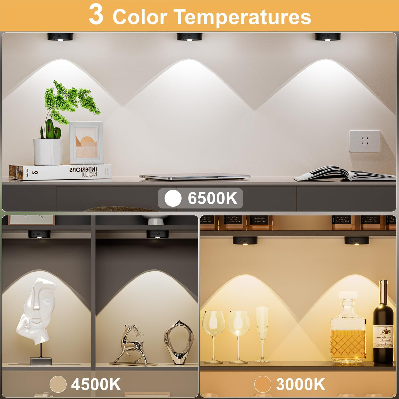 rechargeable puck lights with remote, 3 colors under cabinet lighting wireless, 1500mah led push lights with timer & dimmer, stick on lights under cabinet for kitchen, closet, shelves?1500mAh Rechargeable Large Battery & USB?:Built in Rechargeable 1500mAh Battery:Our USB led puck lights come with a built-in 1500mAh battery that? not only eco-friendly but also a huge money-saver. With just one charge(2H), these puck lights with remote can shine brightly for a full 18H on max brightness and 60 hours at min brightness,say goodbye to constant battery replacements and hello to a rechargeable puck lights2 Control Options: Our wireless puck lights with remote are designed with you in mind! With 2 intuitive control options, you can easily manage your lighting experience. Switch control can reduce the possibility of accidental touch.1.Slide to select the mode. 2.Short press for dimming. 3. Long press to switch colors. IR control: Point remote directly at each led push lights to set them individually.3 Colors & 5 Dimming:The under cabinet lighting wireless offer 3 color temperatures to match your mood or activity: Warm (3000K) for cozy ambiance, Natural White (4500K) for balanced lighting, Cool White (6500K) for bright illumination. With 5 brightness levels (10%, 30%, 50%, 70%, 100%), you can easily adjust on the remote to fit any setting. Whether you're relaxing, working, or entertaining, the under cabinet lights let you create the perfect atmosphereWireless & Easy to Install: Install your push lights in seconds with 2 hassle-free options: 1. Magnetic Mounting: Each rechargeable under cabinet lighting features built-in strong magnets, allowing you to attach lights effortlessly to any metal surface. 2. Stick on Lights: Use the included adhesive sheet for a super-fast installation-just peel and stick in under 3 seconds, no screws or complicated setups requiredTimer & Memory Function: You set your stick on lights under cabinet to turn off automatically after 15, 30, or 60 minutes-perfect for those moments when life gets busy and you forget to switch them off. These under cabinet puck lights remember your preferences. Every time you turn them on, they light up with the exact brightness you chose last time, which making your space cozy and efficient without any extra effort