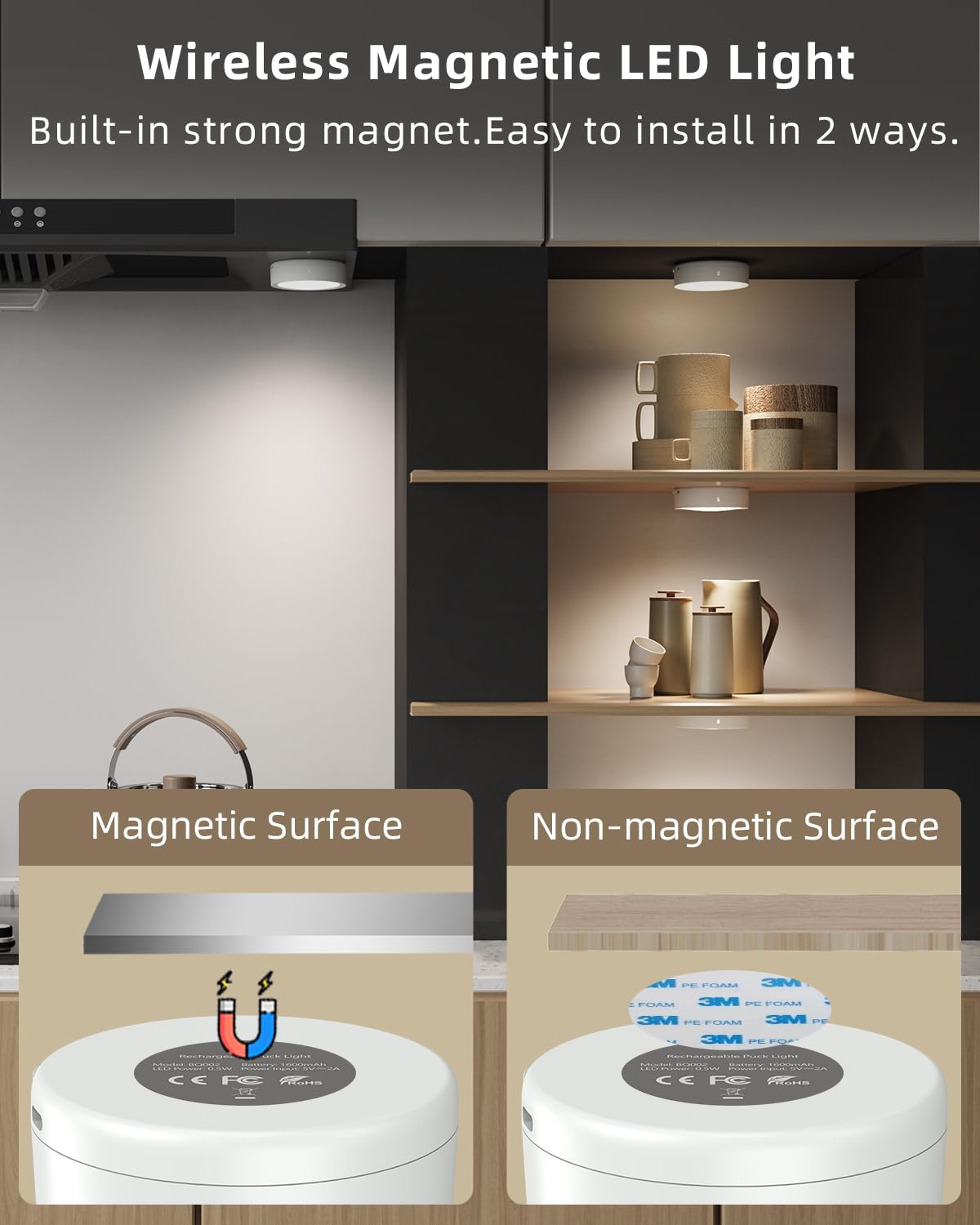 Q: What is the best use for these rechargeable puck lights?A: These versatile puck lights are ideal for under cabinet lighting, closet illumination, display shelves, or as wall sconces, providing both functionality and aesthetic appeal.