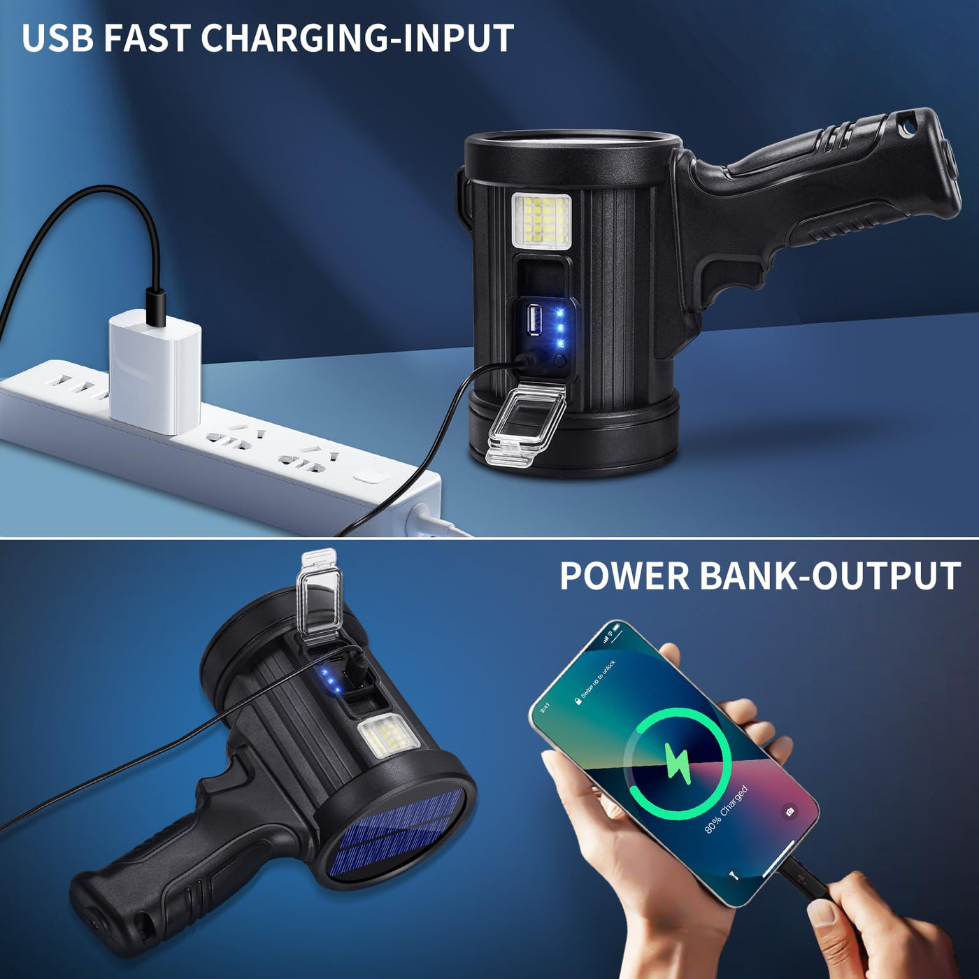 Spotlight Flashlight, 1000000 Lumens Brightest Led Rechargeable Spotlights, Long Running Spot Light Searchlight, Outdoor Handheld Spotlight With Solar Panels For Hunting,Camping,Boat, 6 Spotlight Modes, Built-In 9600Mah Rechargeable Battery,