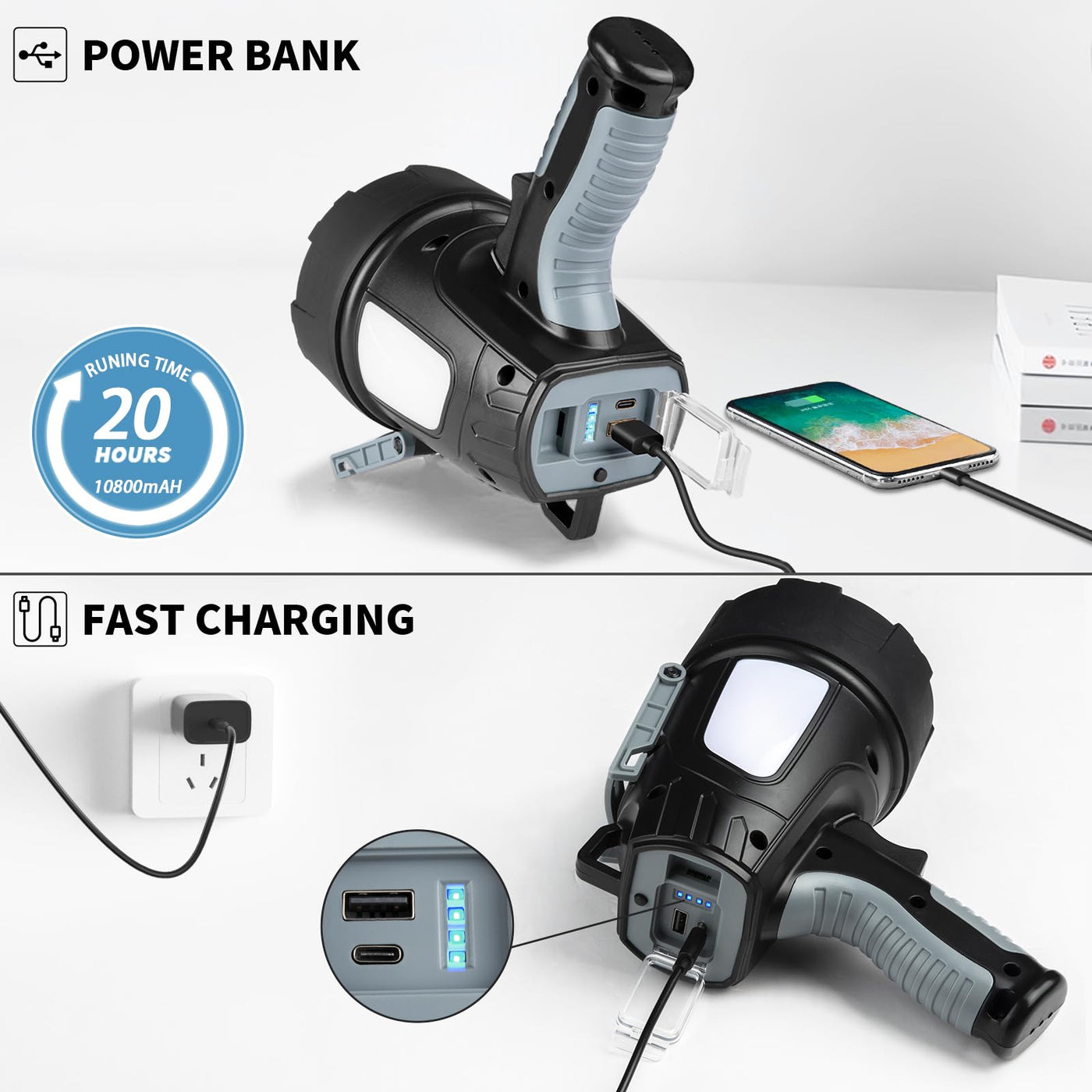 Q: Can I use the spotlight as a power bank?A: Yes, the rechargeable spotlight is equipped with USB input and output ports, allowing it to be used as a mobile power supply to charge other devices when needed.