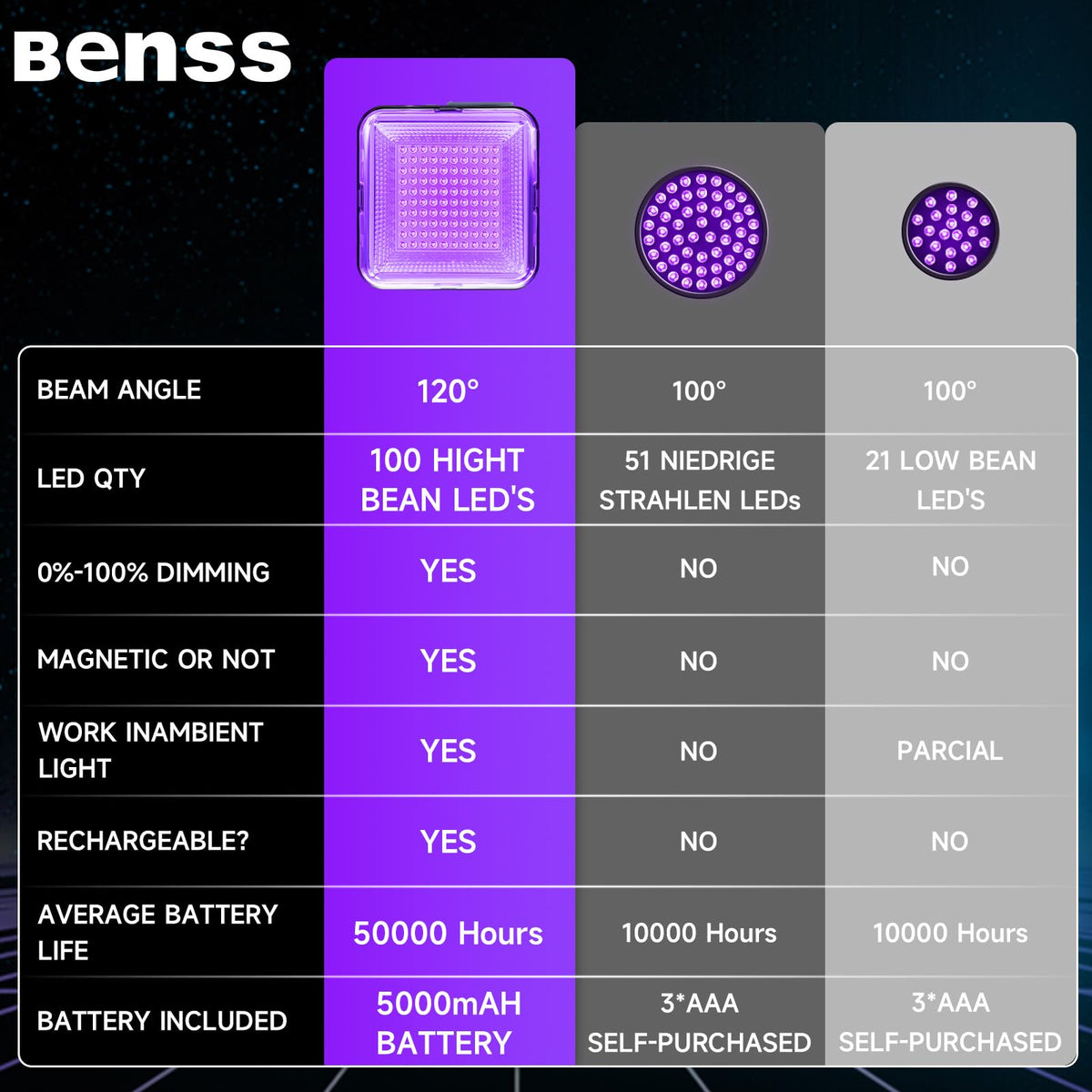 Benss Led Black Light - The Uv Flashlight For Every Need Discover The Ultimate In Versatile Lighting With The Benss Black Light Flashlight Mini, A Powerful And Portable Uv Flashlight Designed For A Wide Range Of Applications. Whether Youre Detecting Pet Urine, Hosting A Glow Party, Or Verifying Official Documents, This Rechargeable Uv Led Black Light Is Your Go-To Solution. Pet Urine Detection: The Black Light (385-395Nm) Reveals Dry Stains From Dogs And Cats In Seconds, Making It An Essential Pet Urine Detector Light For Pet Owners.&Nbsp; Multi-Purpose Use: From Detecting Uranium Glass And Scorpions To Authenticating Currency And Verifying Ids Or Passports, This Uv Flashlight Is A Versatile Tool. Its Also Perfect For Body Painting, Fluorescent Parties, Hotel Cleaning, And Even As A Nail Dryer. Adjustable Brightness: Enjoy High Brightness Lasting 4 To 6 Hours Or Low Brightness Extending Up To 12 Hours. Adjust The Brightness With A Simple Long Press On The Power Button For Seamless Control. Portable &Amp; Rechargeable: Charge Your Phone Via The Usb Port And The Black Light Flashlight Via The Type-C Port. Package Contents: 1 X 60W Uv Led Black Light 1 X&Nbsp; Type C Cable 1 X Hook Note: The Case Temperature May Rise After Prolonged Use, Which Is Normal. Avoid Direct Contact With Your Hands When Hot. Perfect For Halloween, Christmas, New Year, Or As A Unique Gift, The Benss Black Light Flashlight Mini Is A Must-Have Portable Black Light For Every Occasion. Whether Youre Using It As A Uv Resin Light, A Rechargeable Uv Battery-Powered Light, Or A Black Light For Glow Parties, This Blacklight Flashlight Delivers Unmatched Performance And Versatility.