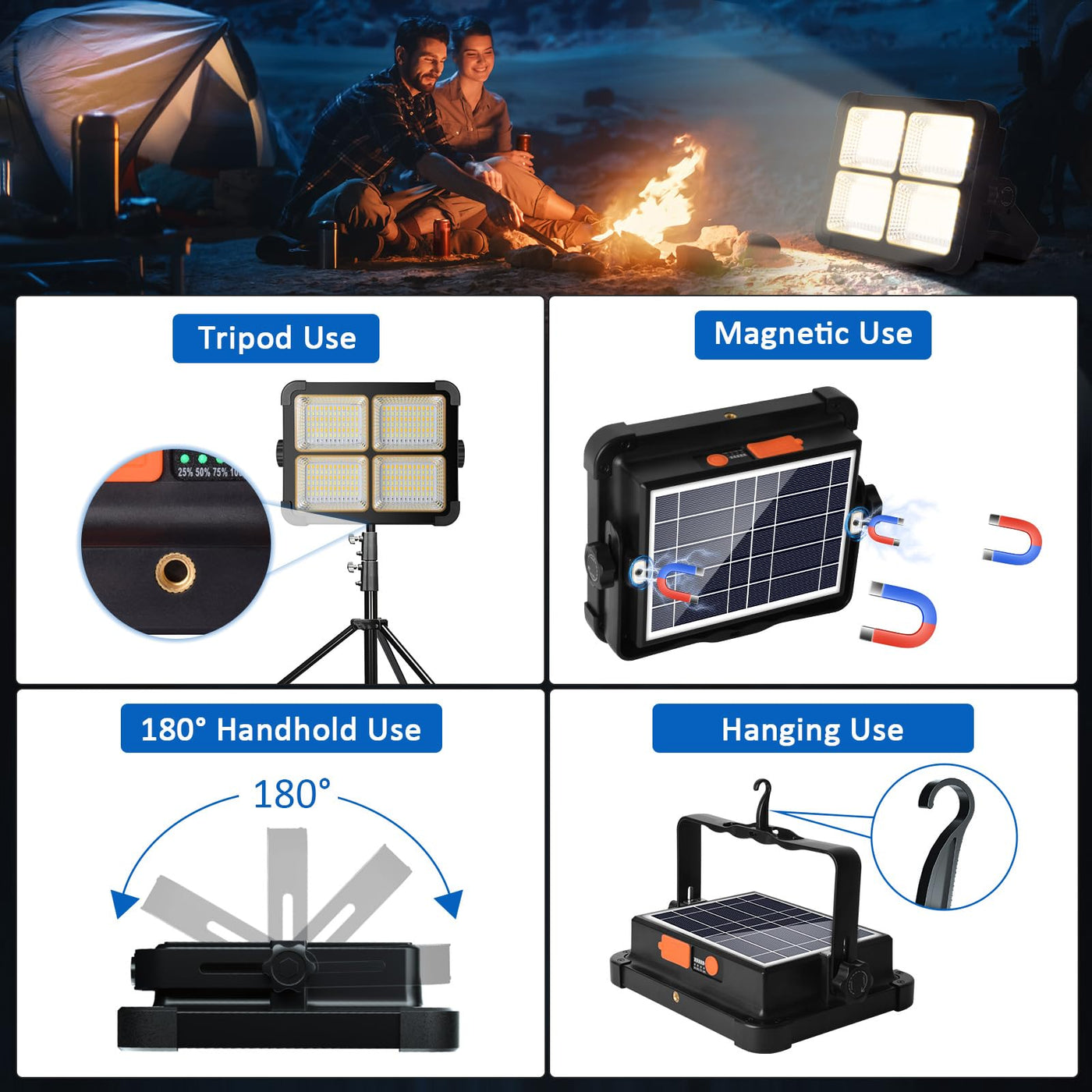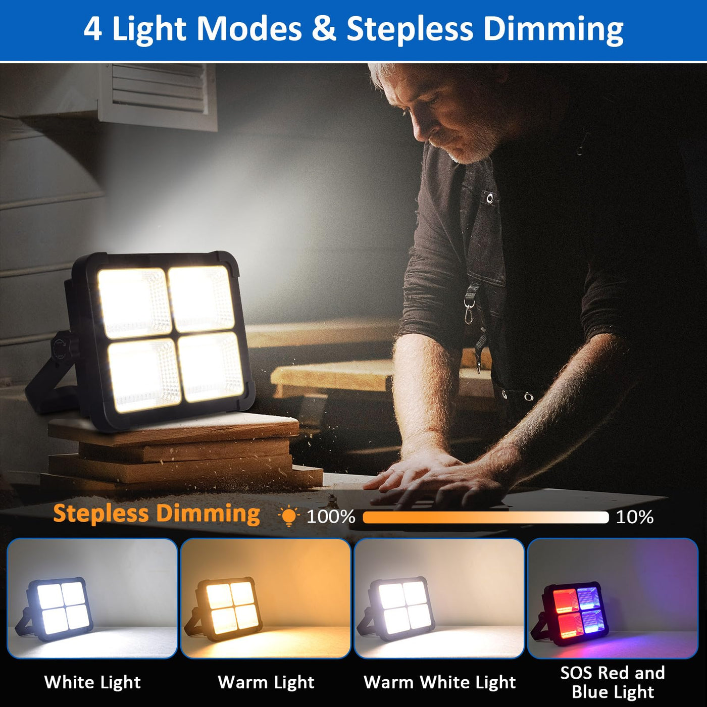 Rechargeable Work Light 100W, Solar Work Light 12000mAh, 4 Lighting Modes/Stepless Dimming, Portable for Camping, Car Repair, Po