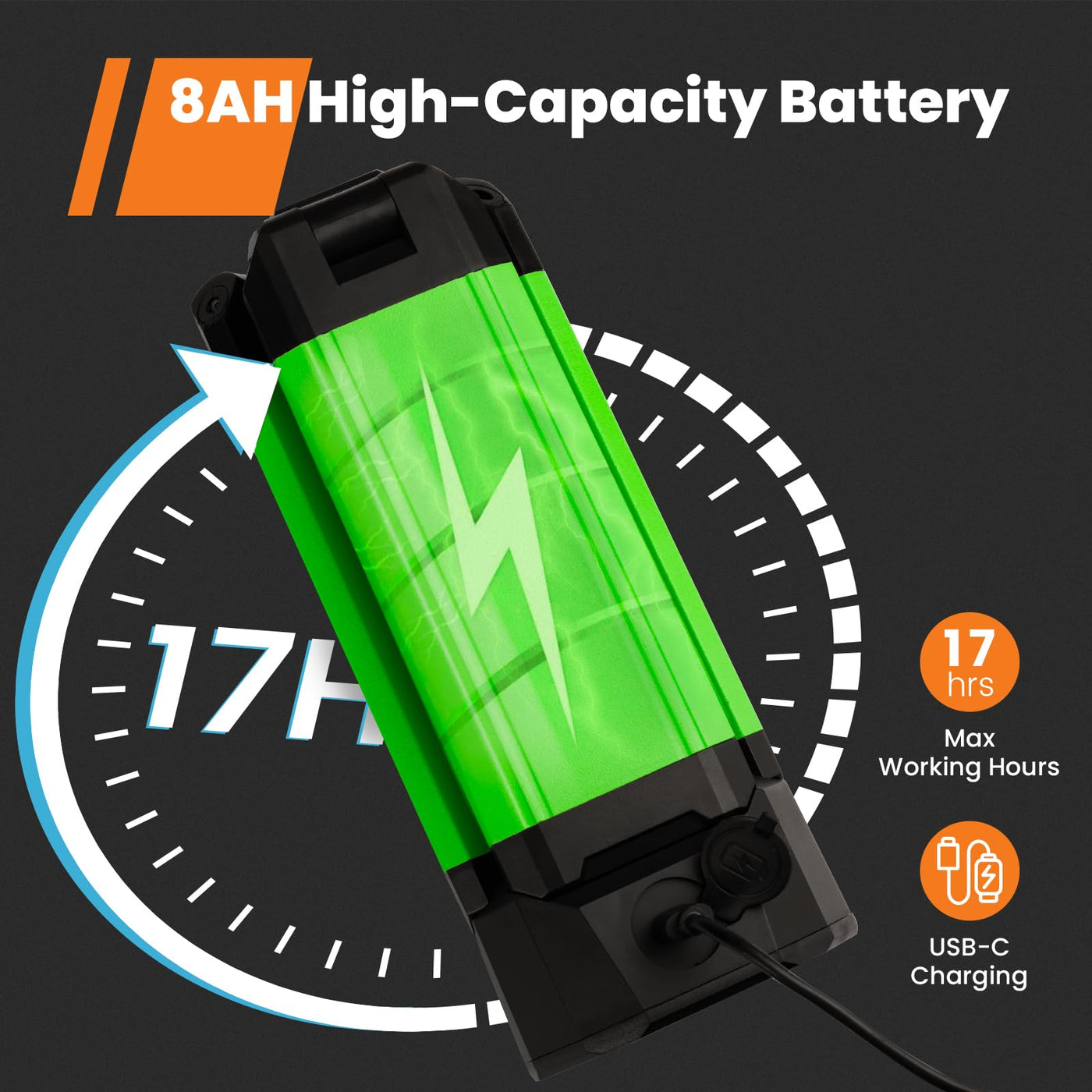 Q: How long does the battery last on a full charge?A: With its 8 AH high-capacity battery, the work light can provide up to approximately 17 hours of illumination on the low-brightness setting, making it ideal for extended outdoor activities.
