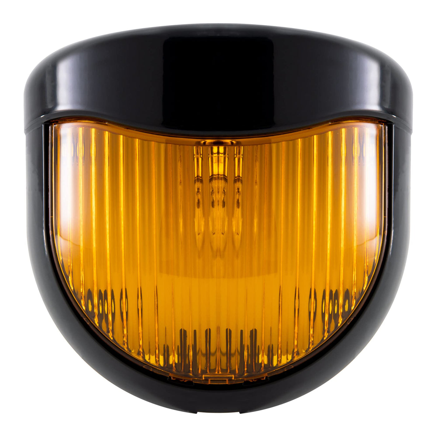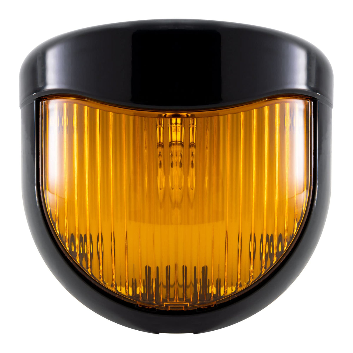 This porch light features a durable black housing made from rigid plastic, ensuring it can withstand various weather conditions. The strong steel backplate provides additional protection for the interior components, making it a robust option for outdoor lighting. The light is equipped with an acrylic lens that is amber-colored, designed to diffuse light effectively over a larger area thanks to its ridged interior. This functionality not only enhances visibility but also adds a warm ambiance to your space.