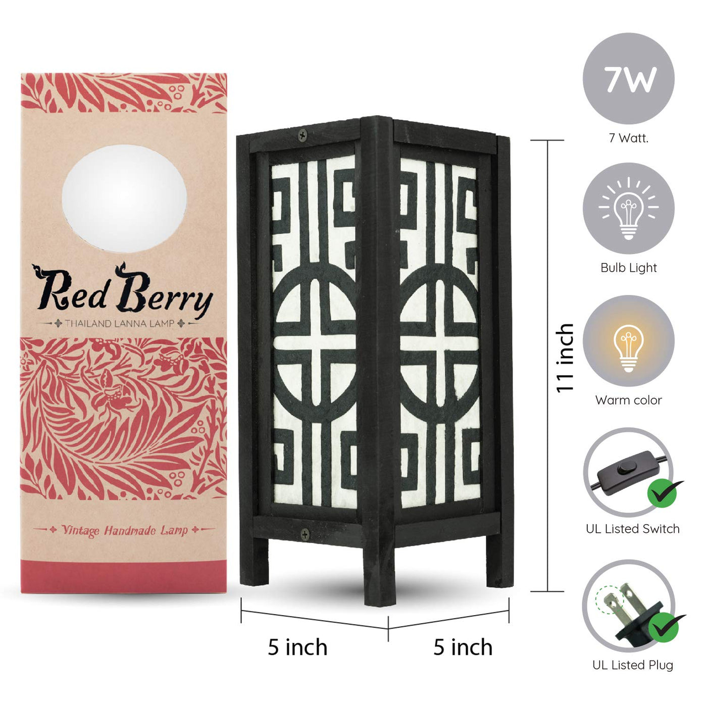 Q: What are the dimensions of the Red Berry Thailand Lanna Lamp?A: The dimensions of the Red Berry Thailand Lanna Lamp are 5 inches in length, 5 inches in width, and 11 inches in height.