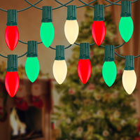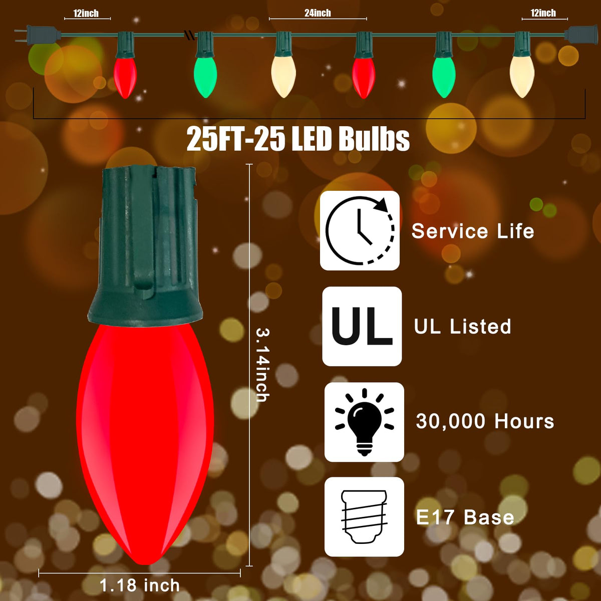 Red Green White LED Christmas Lights,25FT Waterproof C9 Multicolor Christmas Lights Outdoor with 26 Shatterproof Bulbs,Commercial Hanging Christmas Lights for Roof Patio Balcony Party Xmas Decor C9 LED Christmas Lights Bright your Life Specifications Total Length: 25 feet Bulbs Count: 26(1 sapre) Bulbs Material: Plastic Bulb type: LED Plastic Bulbs Screw Base: E17 Candelabra Base Bulbs Color:Red Green White Fuse: 5 Amp, plus ONE spare fuse in the male plug End-to-end Connectable: Connect up to 28 strings. Voltage: 120V Watt: 0.6 watt each bulb, 15W per string Package Includes 1 * 25FT Green String Lights 25 * C9 LED Lights Bulbs 1 * Spare Bulbs 1 * Spare Fuse (already installed in fuse) 1 * Instruction Manual