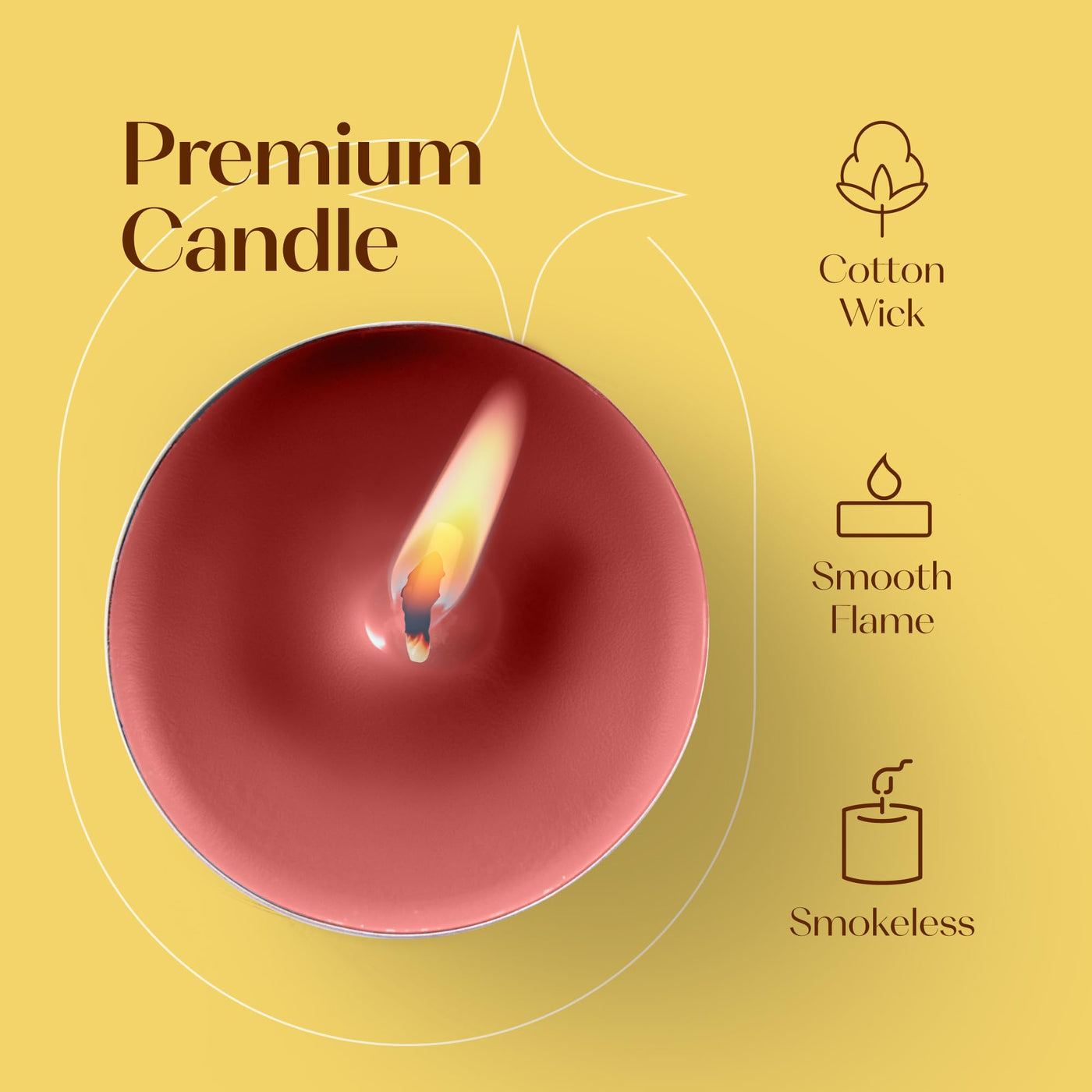 Q: What is the burn time of the Red Scented Tealight Candles?A: The Red Scented Tealight Candles have a generous burn time of 4.5 hours, allowing you to enjoy their delightful aromas for an extended period.