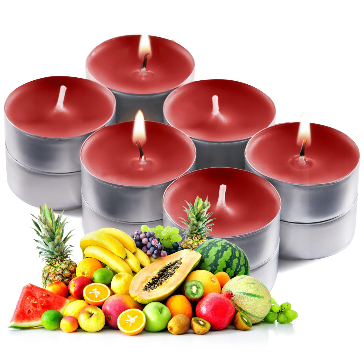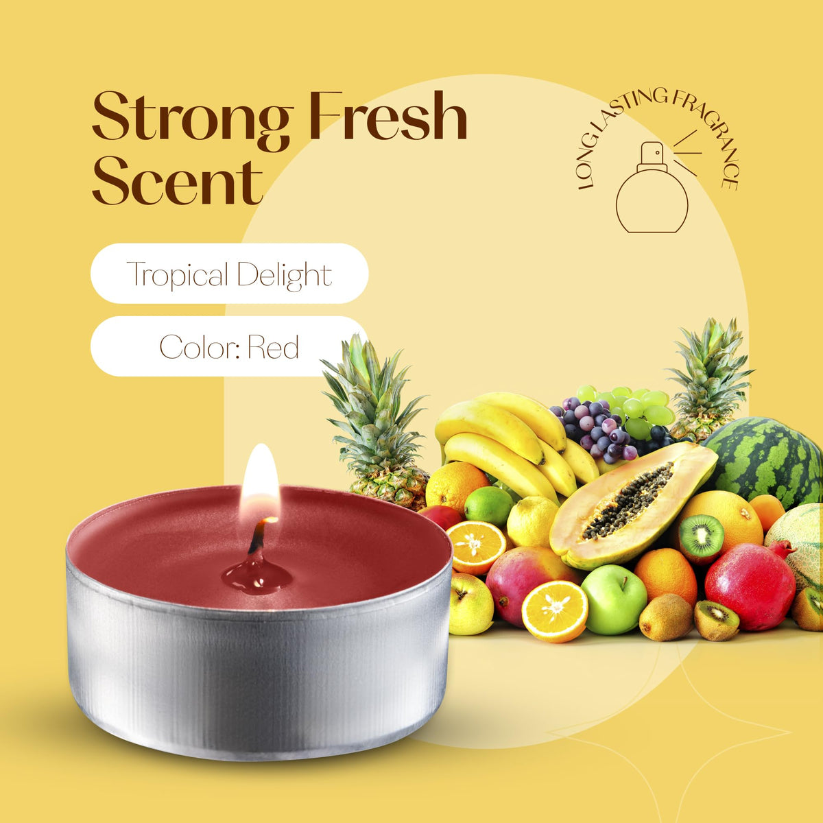 Red Scented Tealight Candles - Pack Of 12 Red Tea Lights Candles With Long Lasting Aromas - Tropical Delight Fragranced Red Tealight Candles - 4 Hour Burn Time