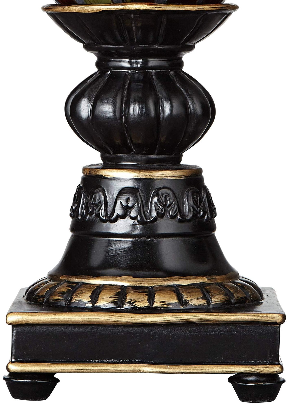 - **Art Glass Shade**: The shade is meticulously crafted from amber and brown-toned mosaic art glass pieces, complemented by an antique dark bronze finish base and vintage gold accents. The cast resin construction of the lamp base ensures durability while maintaining its elegant appearance.
