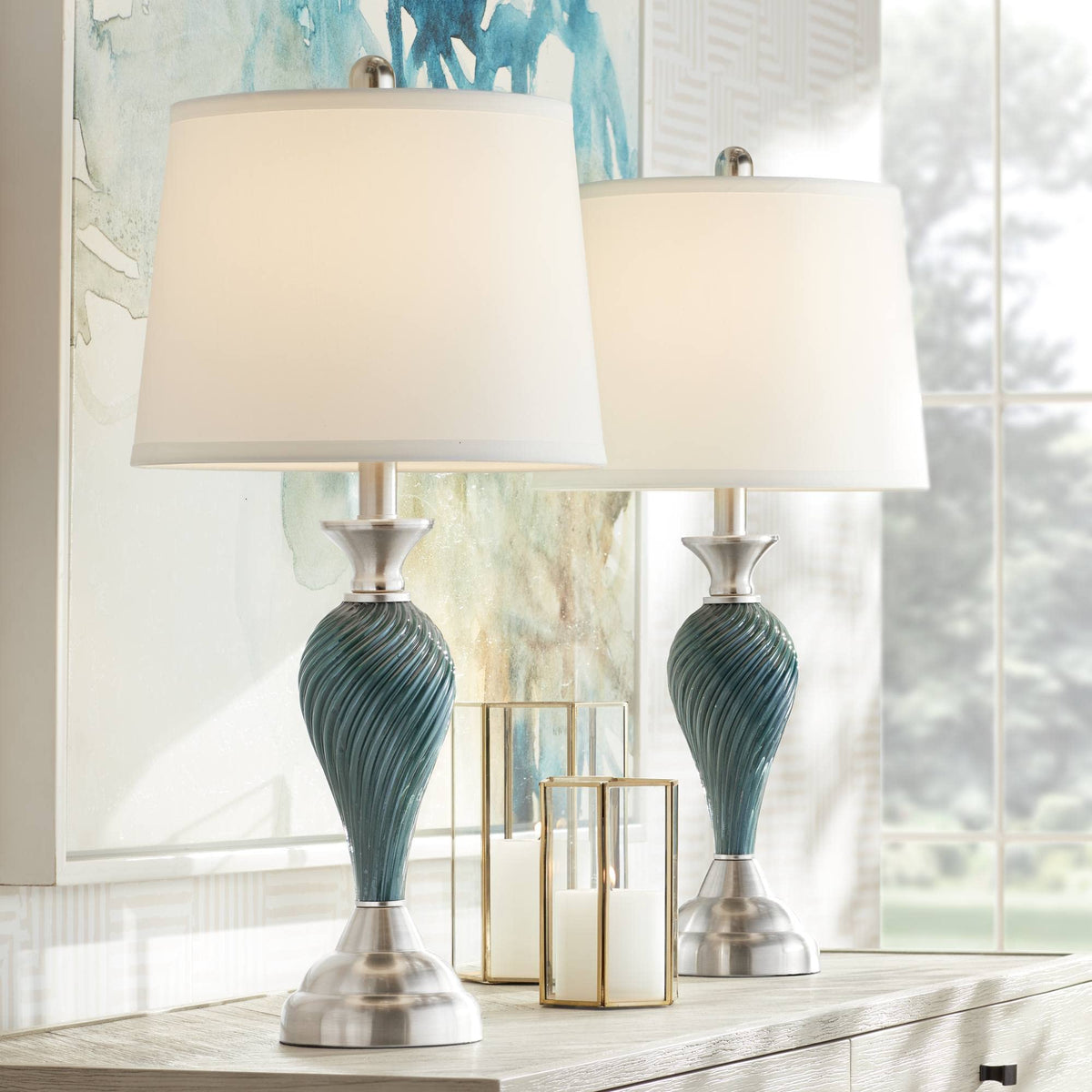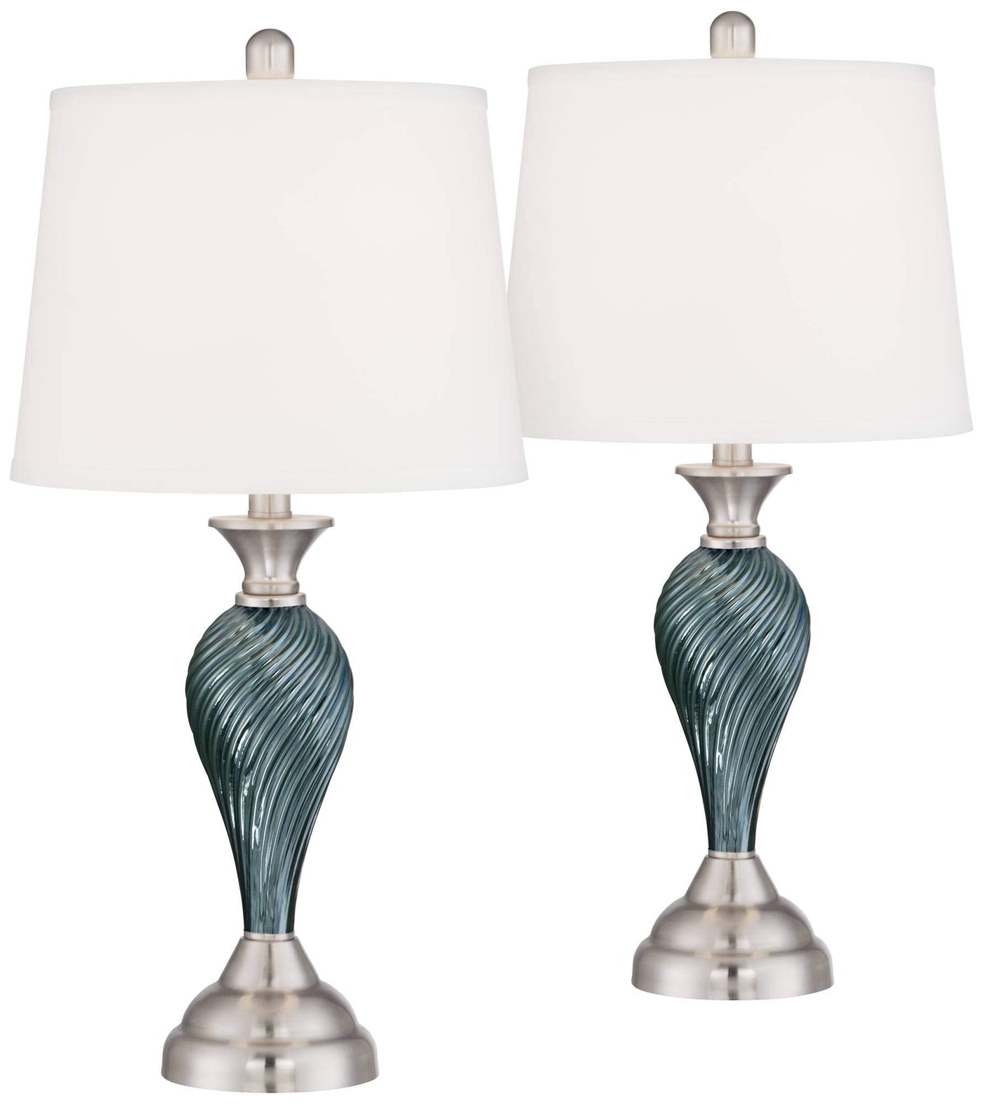 Q: What materials are the Regency Hill Arden Table Lamps made from?A: These lamps feature a twist-pattern base made from green-blue glass, complemented by brushed nickel finish metal accents. The shades are made from white fabric with an empire profile, adding elegance to the design.