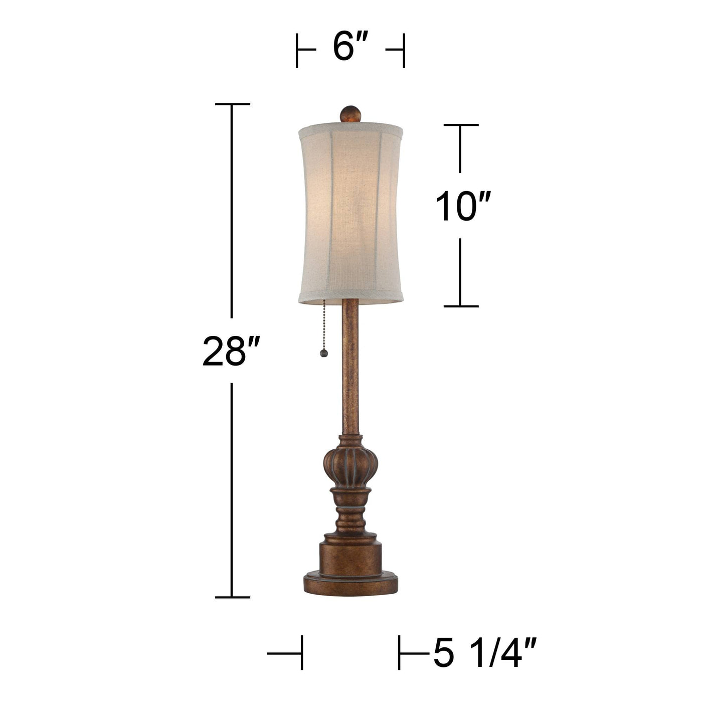 Q: What are the dimensions of the buffet table lamps?A: Each buffet table lamp in the set stands 28 inches tall overall, with round bases measuring 5 1/4 inches wide. The shades are 10 inches high and 6 inches wide.