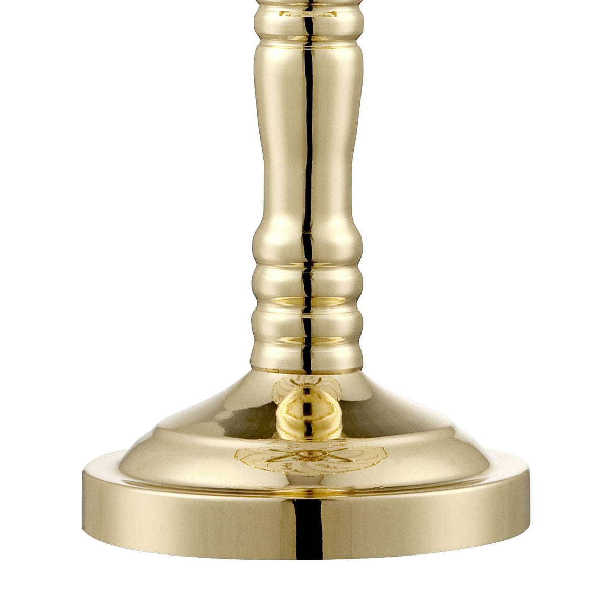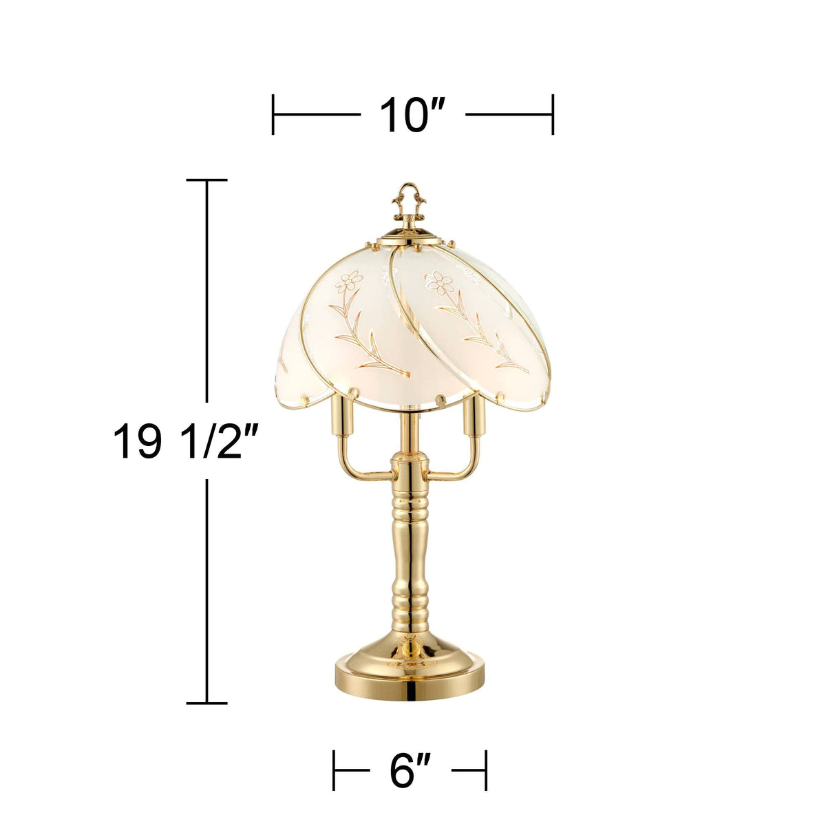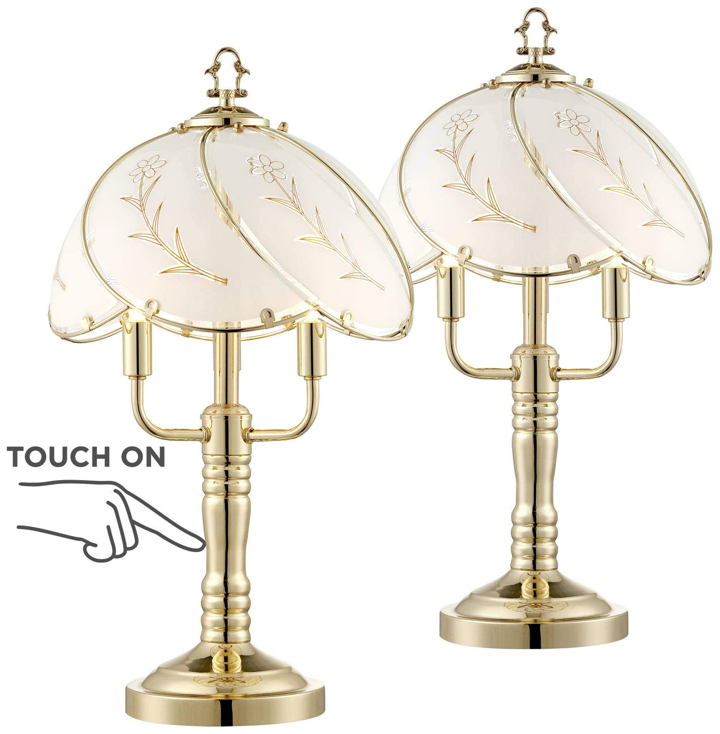 This touch table lamp set features a delicate looking flower-etched glass shade. Its handy one-touch feature allows you to simply touch the polished brass finish base to turn on or off. Touch feature control makes these easy to operate on a bedside table.