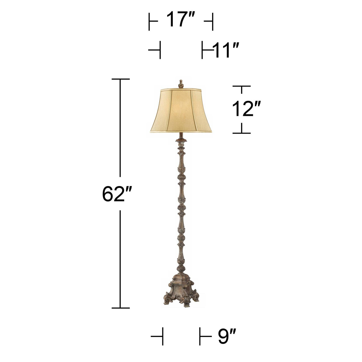 This floor lamp features elaborate details and has the look of a French antique. The distressed faux wood finish on the traditional candlestick-style lamp brings a feeling of European elegance to a space. The combination of the refined look of the floor lamp and the glow created by the faux silk bell shade makes this style the perfect addition to traditional interiors. From the Regency Hill collection of floor lamps.