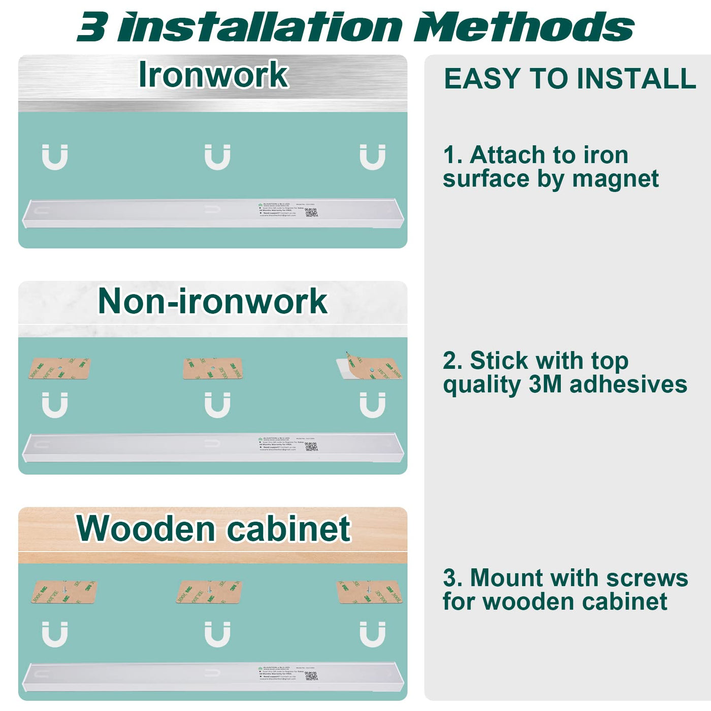 Q: What are the installation requirements for this motion sensor light?A: The installation of the Reoshine Under Cabinet Lighting is wireless and very simple. It comes with a built-in strong magnet and a 3M sticker, allowing you to attach it to any surface without the need for wires, tools, screws, or nuts.