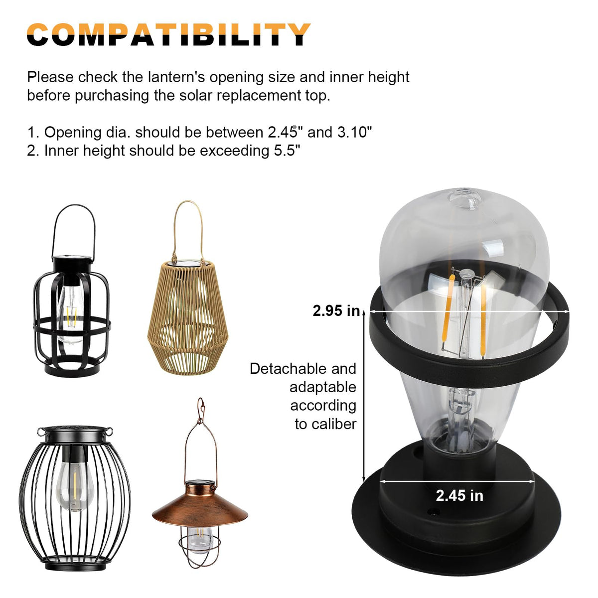 Q: What sizes do the replacement solar light tops accommodate?A: The replacement solar light tops feature an outer ring size of 3.34 inches, with an inner detachable and adjustable circle that fits diameters of 2.91 inches and 2.48 inches, making it compatible with most solar lanterns and products on the market.