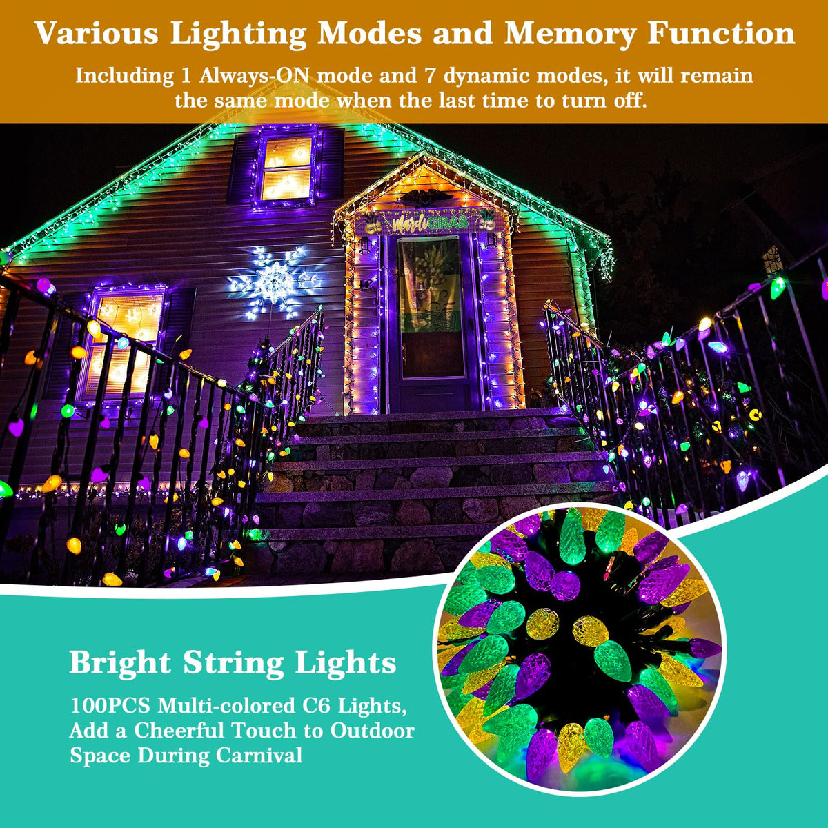 Reyeeinc 100 Led C6 Strawberry Fairy Lights For Xmas Tree Garden Yard Patio Arbor Decor User Friendly Designs Auto On/Off: Press The Power Button Once To Turn On In The First Time To Use; When It Gets To Dark They Turn On Automatically And Turn Off At Sunrise, Absolutely Perfect For Decorating Where There Is No Access To Electricity. Colored Strawberry Lights For Carnival Decors: It Comes With 100 Diamond C6 Strawberry Shaped Led String Lights And Total Length Is 39Ft, Very Long To Wrap On Fence, Shed Or Balcony, Also Perfect Around The Tree And Bushes, Etc. Various Lighting Settings: These Unique Outdoor Mardi Gras Decorations Have Multiple Settings(8) To Make Them Flash In Various Patterns Or Stay On Steady, Your Could Set The Mode As You Prefer. Memory Function: Turn The Strawberry Lights Off And Turn On Again, It Will Remain The Same Mode The Last Time You Set. Simple To Set Up: Put The Solar Strawberry Lights Outdoor, Plug Or Put The Solar Panel In Where Can Get Direct Sunshine And Keep The Switch ''On'', Even Mardi Gras Past, You Can Also Put Where You Want To Decorate, Energy Saving And No Extra Cost. Perfect Solar Mardi Gras Lights Decorations: Reyeeinc Solar Mardi Gras Lights Are Great Help To Decorate For Mardi Gras, These Lights Are Gorgeous, Bright, And Festive, The Purple, Yellow, And Green Colors Stand Out, Looking Great On Mardi Gras Tree, Great Addition For Mardi Gras Themed Event.