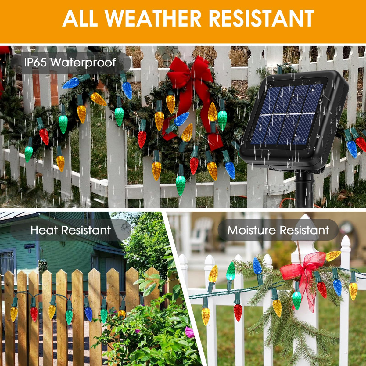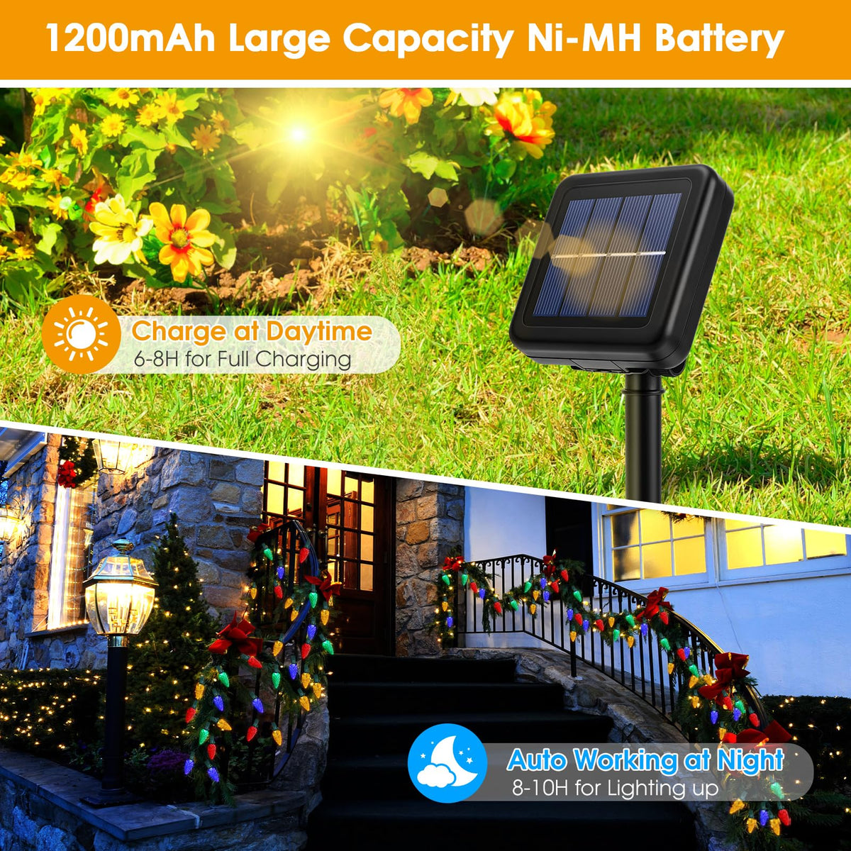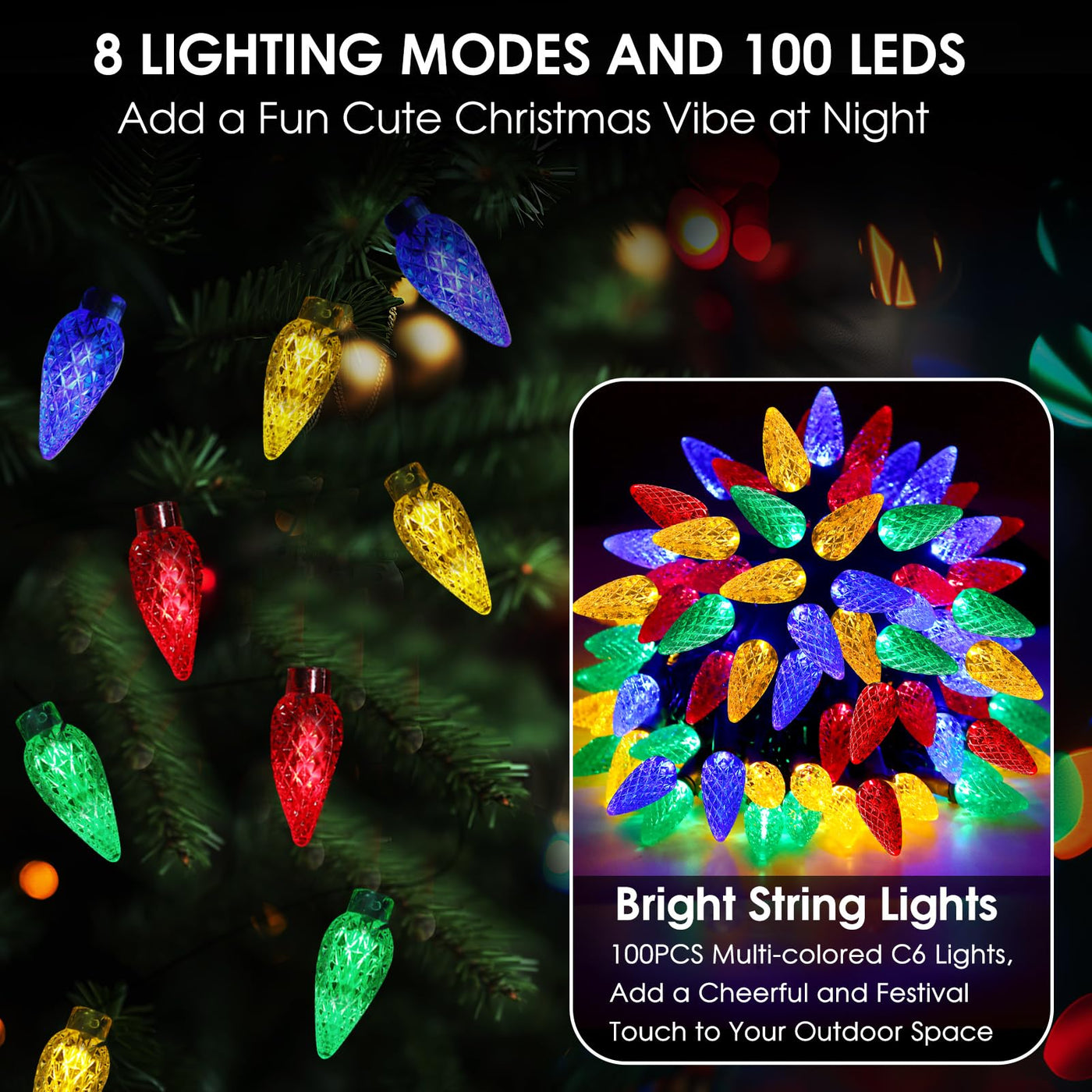 Reyeeinc Solar Powered Christmas Lights For Outside, Solar Outdoor Xmas Lights With 100 Count C6 Multicolored Strawberry String