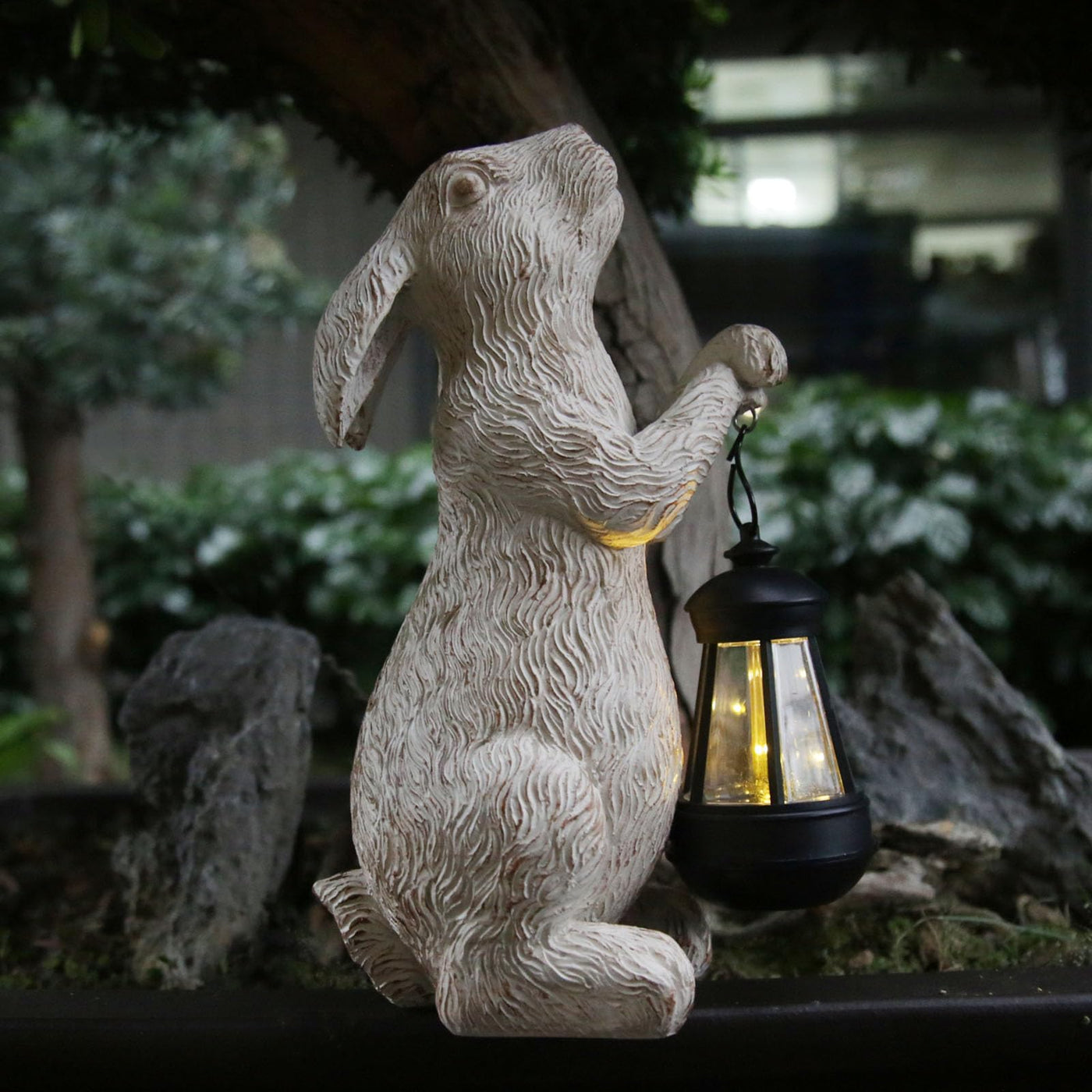?Charming Solar-Powered Companion?This charismatic bunny outdoor decor gracefully holding a solar lantern, adds a touch of magic to your outdoor space, casting a warm and welcoming glow. Rabbit statue 7.8''x 4.9''x 11.8'' size ensures it becomes a focal point in your garden, pathway, or even on a wide windowsill, leaving a lasting impression. | ?Easy to Operate Christmas Yard Decor?Simply leave it in the ''on'' position during the day. Just place solar garden statue in a sunlit spot, and let the magic happen as the solar panel harnesses energy during the day for a captivating display at night. The LED lights will be fully charged in 6-8 hours and will stay lit for 8-10 hours. | ?Beautiful Garden Statue Gift for Mom and Grandma?Solar powered garden bunny statues are perfect for housewarming gifts, birthday gifts and even engagement gifts for family and friends. Also a great gift choice for Easter, Christmas, Thanksgiving, Mother's Day. | ?Multi-Venue Suitable?These cute outdoor statues are perfect decoration for garden, outdoor, patio, lawn, yard, front porch, ground, balcony, backyard, walkway and many areas of your home, make your home warm and lively. | ?High Quality Bunny Decoration?The bunny statue solar garden decor is made of sturdy and durable weatherproof resin, hand-painted and coated with UV protection to maintain its original look even in harsh environments. Enjoy the beauty of this radiant bunny garden sculptures & statues year-round.
