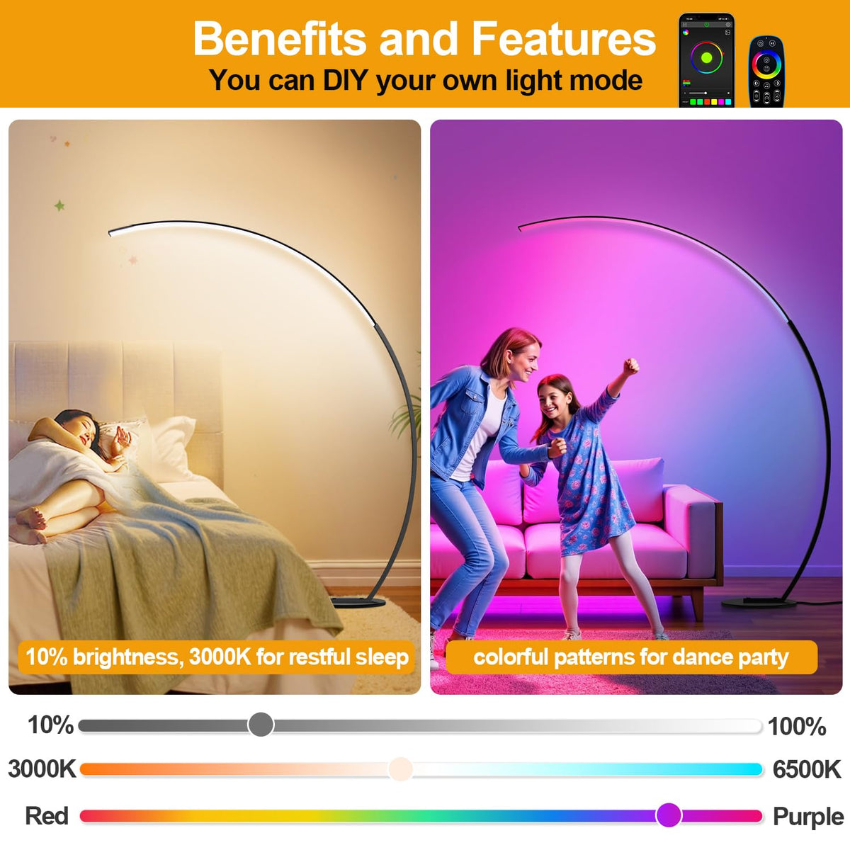 Rgb Dimmable Arc Floor Lamps With 3 Color Temperatures, Ultra Bright 1800Lm Led Floor Lamps For Living Room, Modern Standing Tal