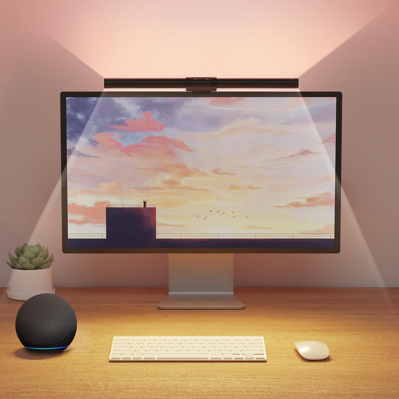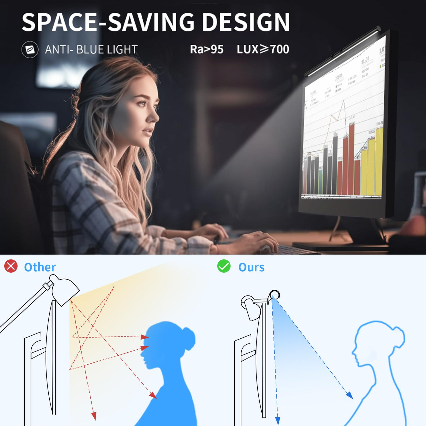 Q: What features make the RGB Monitor Light Bar different from traditional desk lamps?A: The RGB Monitor Light Bar features a space-saving design that sits on top of your monitor, freeing up desk space. It also offers 30+ light scenes and 16 million DIY colors, enhancing your workspace and gaming experience while providing effective glare reduction.
