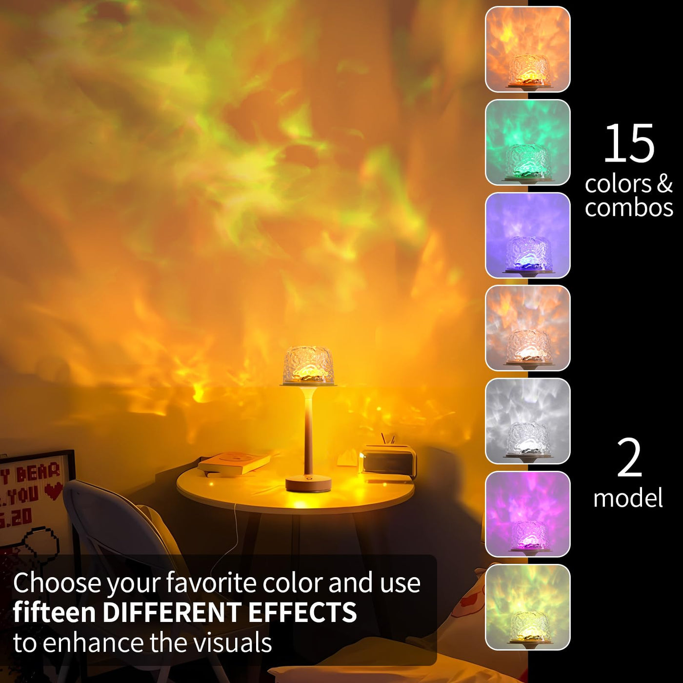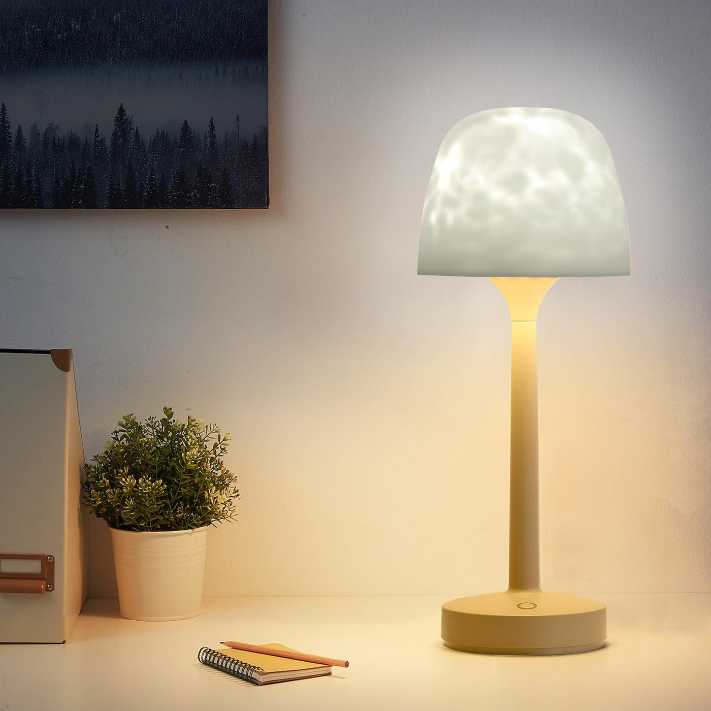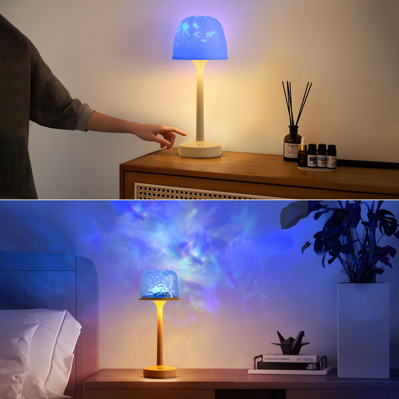 RGB Ocean Wave Projector Table Lamp, USB Rechargeable Cordless Night Light with Remote Control, Dimmable Touch Desk Lamp for Bed