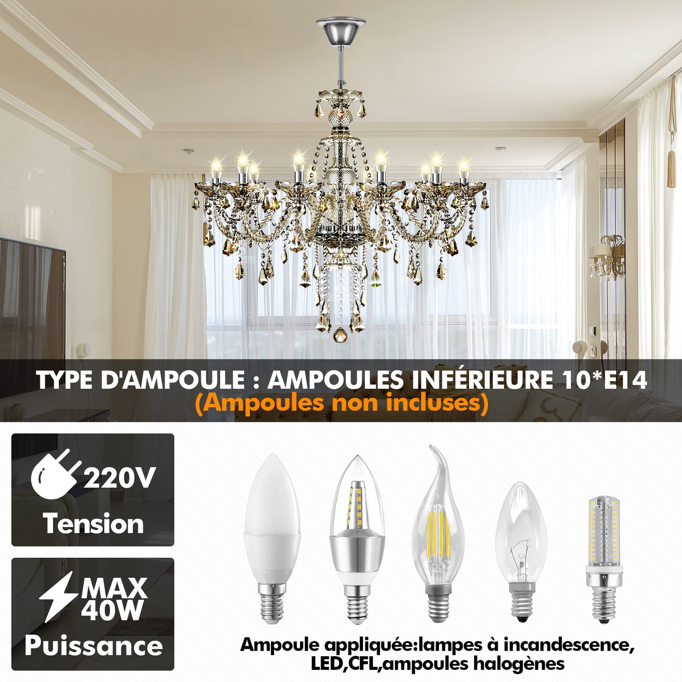 Q: What type of bulbs does the Ridgeyard 10-Light Crystal Chandelier require?A: The Ridgeyard 10-Light Crystal Chandelier requires bulbs with E12 sockets, with a maximum wattage of 40W. You can use incandescent, LED, CFL, or halogen bulbs to illuminate the chandelier.