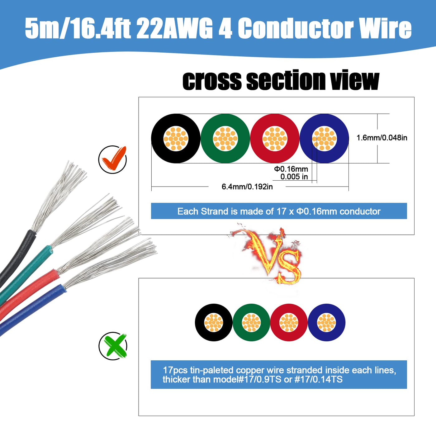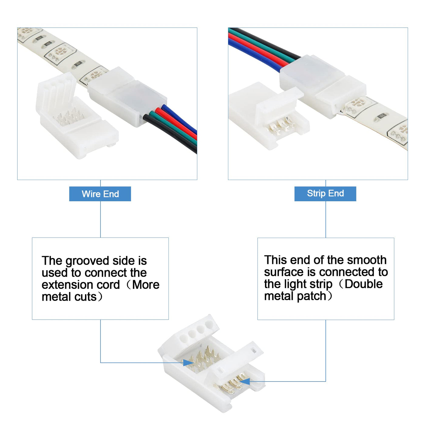 Package 1 X 16.4 Ft Led Light Rgb Strip Extension Cable 12 X 4 Pin Led Light Strip Connectors, Suitable For The 4 Pin 10Mm Light Strip. &Nbsp; Rgb Extension Wire Specification Conductor Material: High-Purity Oxygen-Free Tinned Copper Wires External Material: Insulated Pvc Length: 16.4 Ft / 5 Meters Wire Gauge: 22 Awg Max Voltage: 300V Power: 100W Current: 1A Working Temperature: -30?-80? Od Tolerance: 0.1Mm Color: Black (Align The ''+'' In The Light Strip), Green, Red, Blue Features: Anti-Oxidation, Corrosion Resistance, Easy To Conduct Electricity, Easy To Weld Warning: If The Voltage And Current Of The Circuit In Use Exceed The Maximum Carrying Voltage And Current Allowed For The Chosen Specification, It May Incur Accidents Like Fire And Electric Shock. &Nbsp; Led Strip Light Connectors Specification Material: Flame Retardant Housing + Copper Working Temperature: -22? ~ +185? Wire End: Fits 22 Awg Stranded And Solid Wires Strip End: Fits 4 Pin 10Mm Light Strip, For 3528 5050 Rgb Led Light Strips. If There Is Silicone On The Circuit Of The Strip, Please Peel It Off Before Install. Features: Flame-Retardant, Solderless, No Wire Stripping, Reusable Reusable: Can Be Opened If Needed After Use. Use A Pocket Knife Or Something To Pop Them Open.
