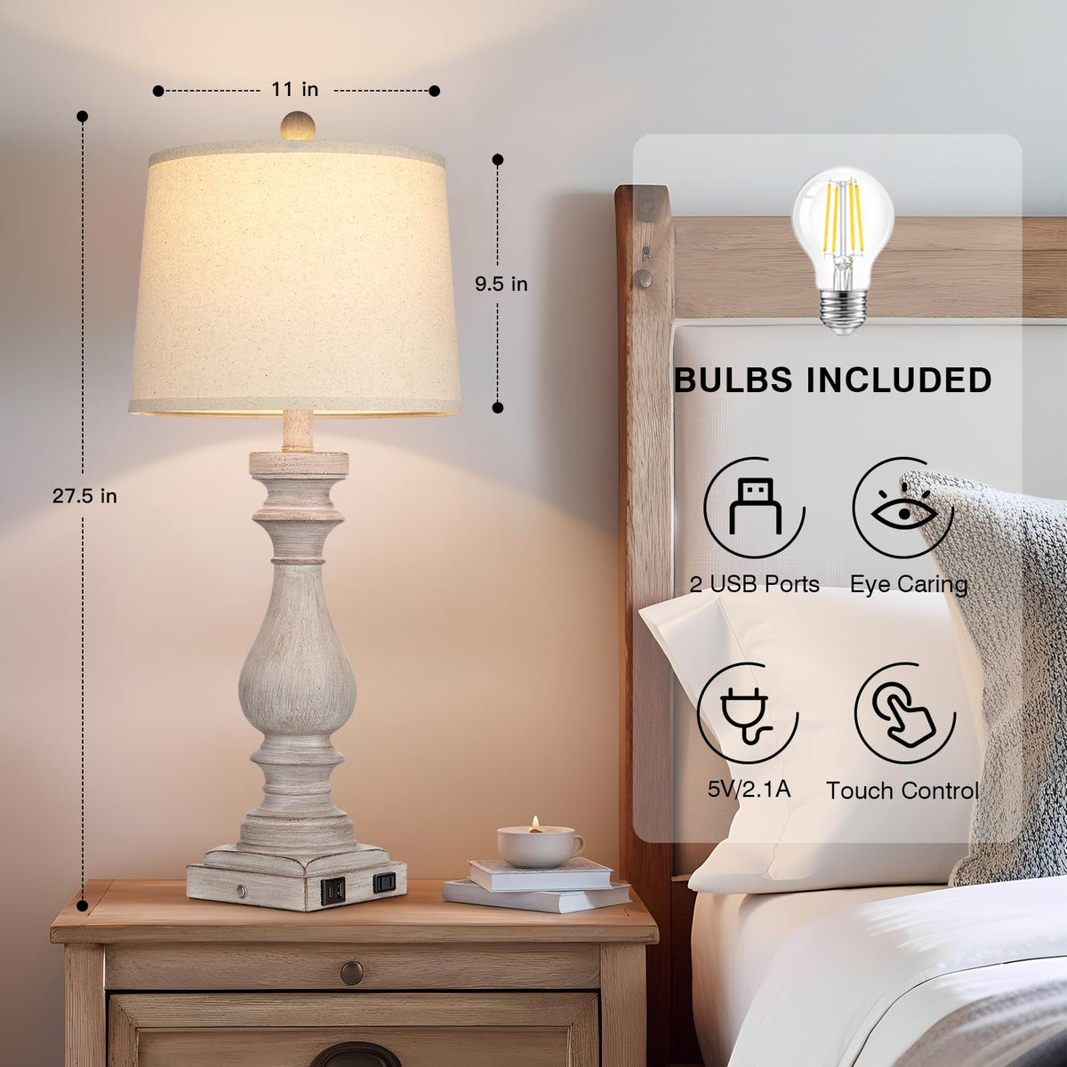 Elevate your space with our elegant 27.5-inch farmhouse table lamp, featuring a rustic, distressed gray finish that complements modern, rustic, industrial, retro, and Nordic decor styles. This table lamp is not only a stunning accent piece but also a functional one, equipped with USB A and C charging ports and an AC outlet to keep your devices powered up and your space clutter-free. The 3-way dimmable touch control allows for easy brightness adjustment, perfect for a nightlight, daily use, or focused tasks like reading or working. Including two LED Edison bulbs for stable, energy-efficient lighting, this lamp is a perfect addition to living rooms, bedrooms, offices, and more. Measuring 27.5 inches in height, 12.5 inches in width and depth, it's designed to fit seamlessly on your tabletop.