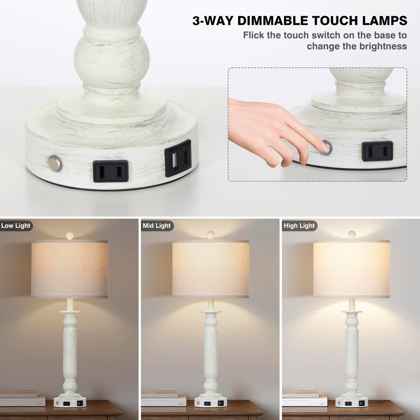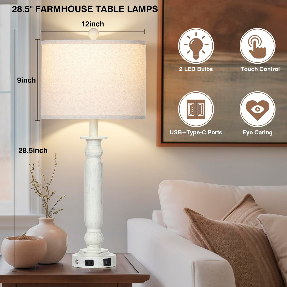 Rinweey 28.5'' Farmhouse Table Lamps For Living Room Set Of 2, 3-Way Dimmable Touch Lamps, Table Lamp With Usb C+A Ports, Bedsid