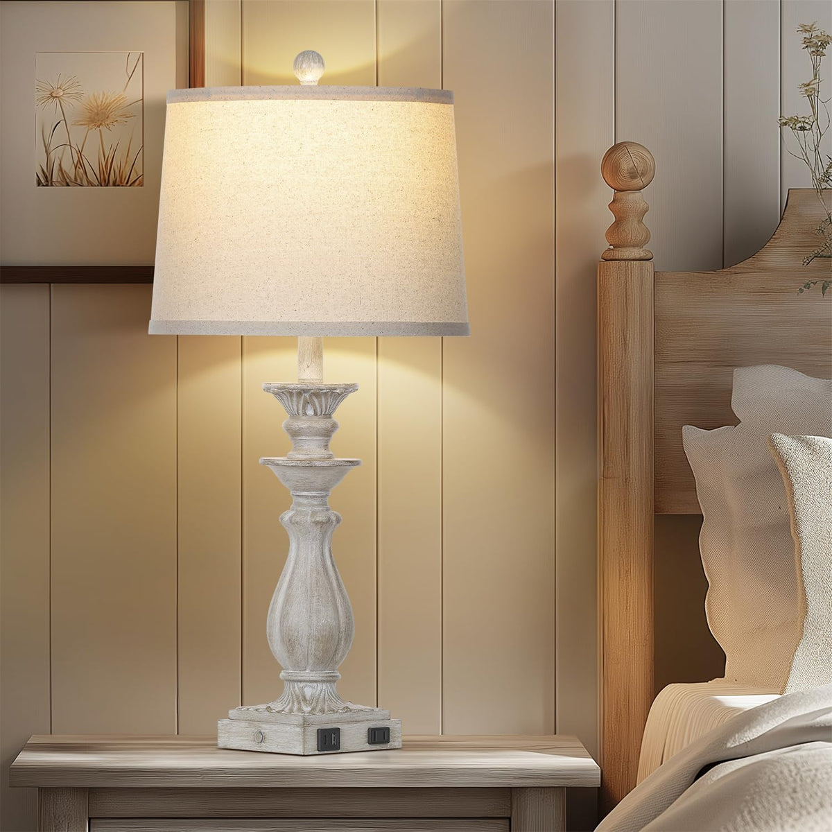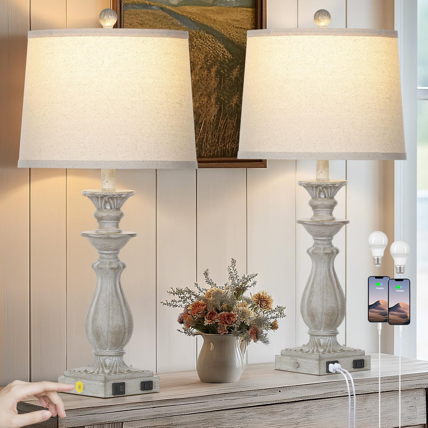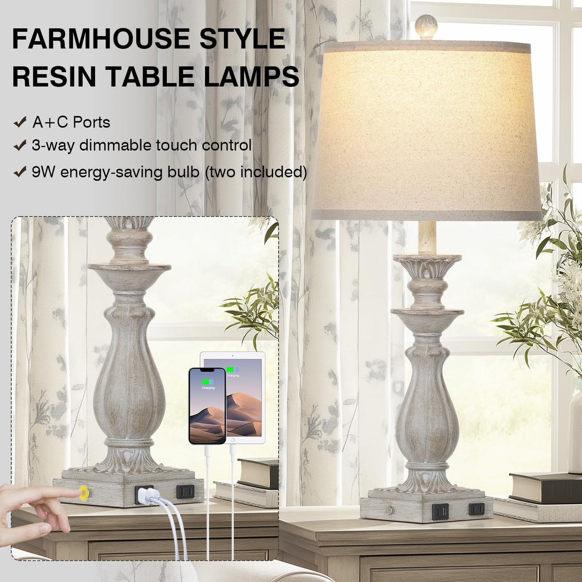 Rinweey 28'' Farmhouse Table Lamps Set Of 2 For Living Room 3-Way Dimmable Bedside Lamps With Usb C+A Ports, Resin Touch Lamp, V