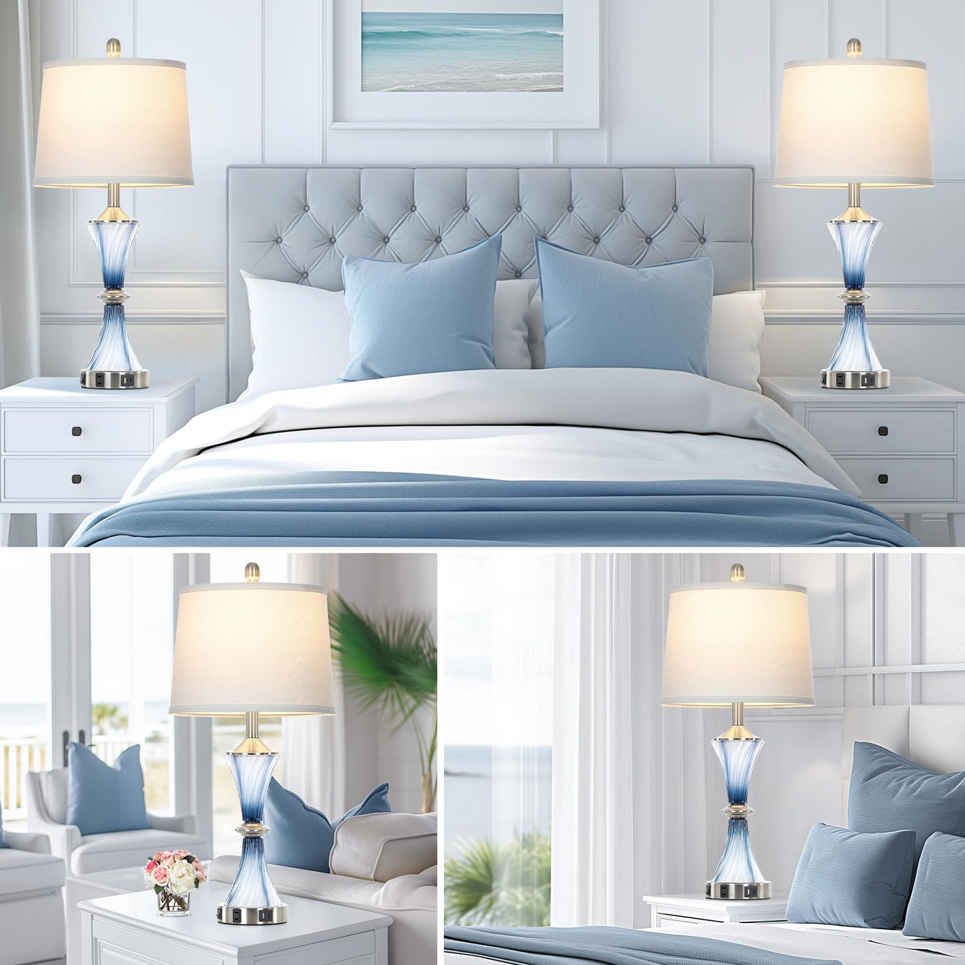 Rinweey Blue Glass Table Lamp Set Of 2 With Usb C+A Ports & Ac Outlet, Bedside Lamps, Modern Bedroom Lamps, Coastal Lamps For Ni