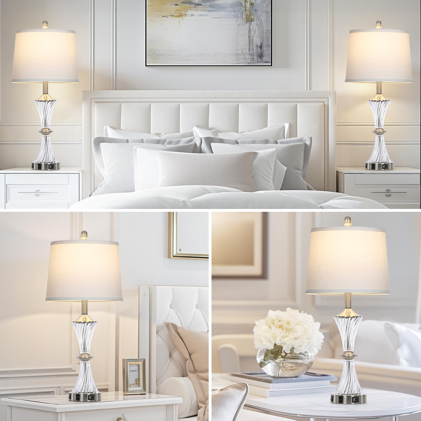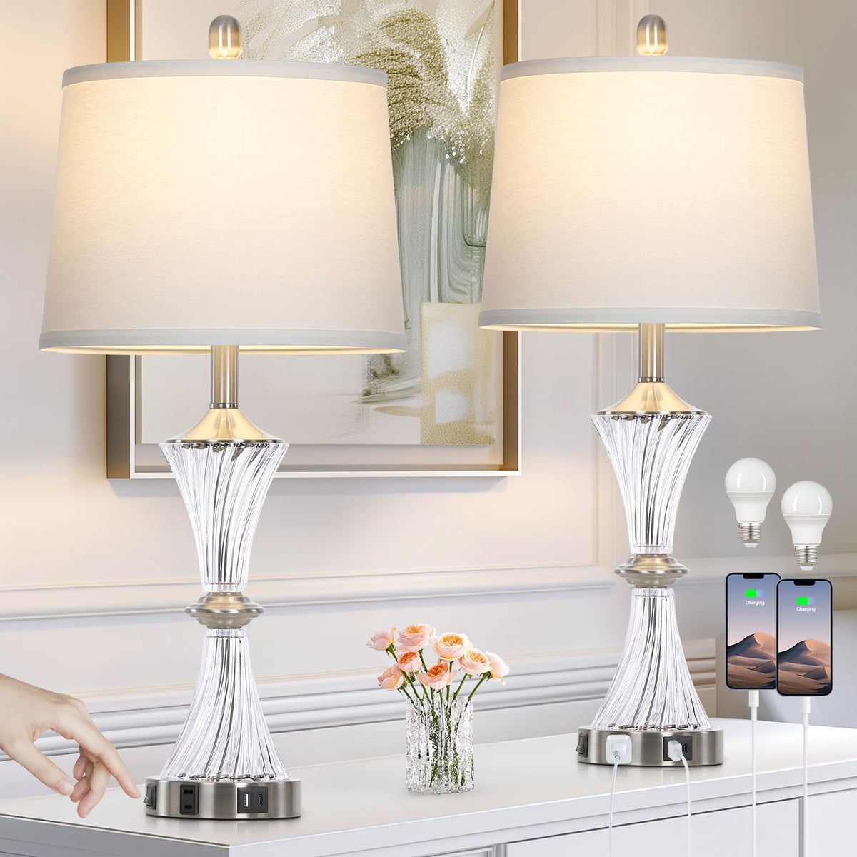 Rinweey Crystal Glass Table Lamp Set Of 2 With Usb C+A Ports & Ac Outlet, White Clear Lamps, Modern Bedroom Lamps, Silver Lamps